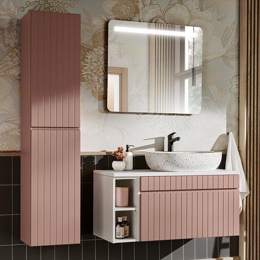 Prezentowana kolekcja mebli to nowoczesne połączenie elegancji i funkcjonalności, zaprojektowane z myślą o najbardziej wymagających użytkownikach. Wyróżnia się unikalnymi pionowymi frezowaniami we frontach i korpusie, które nadają meblom niepowtarzalny charakter i dynamikę. Dzięki tej wyjątkowej strukturze, meble wprowadzają do łazienki ruch i płynność, tworząc harmonijną i stylową przestrzeń. Nowoczesna kolorystyka oraz wyrafinowane detale czynią ją wyjątkową propozycją do każdej łazienki. Zestawy mebli wykonane są z wysokiej jakości materiałów, takich jak płyta laminowana i MDF, co zapewnia ich trwałość i odporność na wilgoć. Starannie dobrane komponenty oraz precyzyjne wykończenie gwarantują, że meble te będą służyć przez wiele lat, zachowując swój piękny wygląd i funkcjonalność. W zestawie znajduje się szafka z blatem, umywalka, regał, wysoki słuperk oraz lustro.