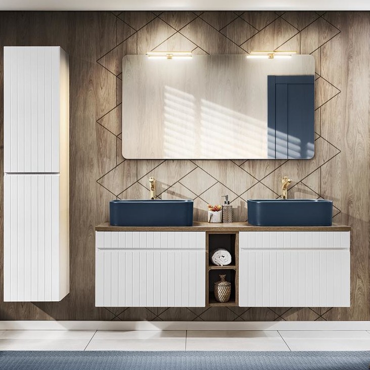 Prezentowana kolekcja mebli to nowoczesne połączenie elegancji i funkcjonalności, zaprojektowane z myślą o najbardziej wymagających użytkownikach. Wyróżnia się unikalnymi pionowymi frezowaniami we frontach i korpusie, które nadają meblom niepowtarzalny charakter i dynamikę. Dzięki tej wyjątkowej strukturze, meble wprowadzają do łazienki ruch i płynność, tworząc harmonijną i stylową przestrzeń. Nowoczesna kolorystyka oraz wyrafinowane detale czynią ją wyjątkową propozycją do każdej łazienki. Zestawy mebli wykonane są z wysokiej jakości materiałów, takich jak płyta laminowana i MDF, co zapewnia ich trwałość i odporność na wilgoć. Starannie dobrane komponenty oraz precyzyjne wykończenie gwarantują, że meble te będą służyć przez wiele lat, zachowując swój piękny wygląd i funkcjonalność. W zestawie znajdują się dwie szafki z blatem i dwoma umywalkami, regał, wysoki słupek, lustro oraz dwie lampki led.