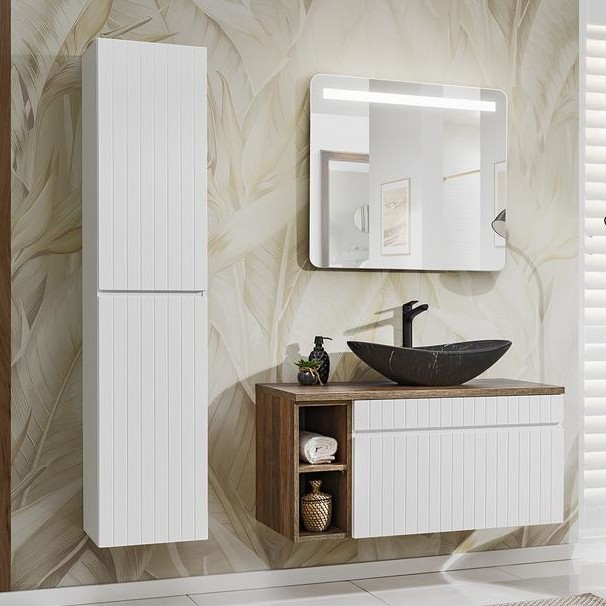 Prezentowana kolekcja mebli to nowoczesne połączenie elegancji i funkcjonalności, zaprojektowane z myślą o najbardziej wymagających użytkownikach. Wyróżnia się unikalnymi pionowymi frezowaniami we frontach i korpusie, które nadają meblom niepowtarzalny charakter i dynamikę. Dzięki tej wyjątkowej strukturze, meble wprowadzają do łazienki ruch i płynność, tworząc harmonijną i stylową przestrzeń. Nowoczesna kolorystyka oraz wyrafinowane detale czynią ją wyjątkową propozycją do każdej łazienki. Zestawy mebli wykonane są z wysokiej jakości materiałów, takich jak płyta laminowana i MDF, co zapewnia ich trwałość i odporność na wilgoć. Starannie dobrane komponenty oraz precyzyjne wykończenie gwarantują, że meble te będą służyć przez wiele lat, zachowując swój piękny wygląd i funkcjonalność. W zestawie znajduje się szafka z blatem, umywalka, regał, wysoki słupek oraz lustro.