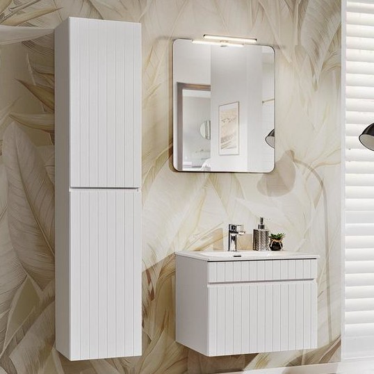 Prezentowana kolekcja mebli to nowoczesne połączenie elegancji i funkcjonalności, zaprojektowane z myślą o najbardziej wymagających użytkownikach. Wyróżnia się unikalnymi pionowymi frezowaniami we frontach i korpusie, które nadają meblom niepowtarzalny charakter i dynamikę. Dzięki tej wyjątkowej strukturze, meble wprowadzają do łazienki ruch i płynność, tworząc harmonijną i stylową przestrzeń. Nowoczesna kolorystyka oraz wyrafinowane detale czynią ją wyjątkową propozycją do każdej łazienki. Zestawy mebli wykonane są z wysokiej jakości materiałów, takich jak płyta laminowana i MDF, co zapewnia ich trwałość i odporność na wilgoć. Starannie dobrane komponenty oraz precyzyjne wykończenie gwarantują, że meble te będą służyć przez wiele lat, zachowując swój piękny wygląd i funkcjonalność. W zestawie znajduje się szafka z umywalką, wysoki słupek, lustro i lampka led.