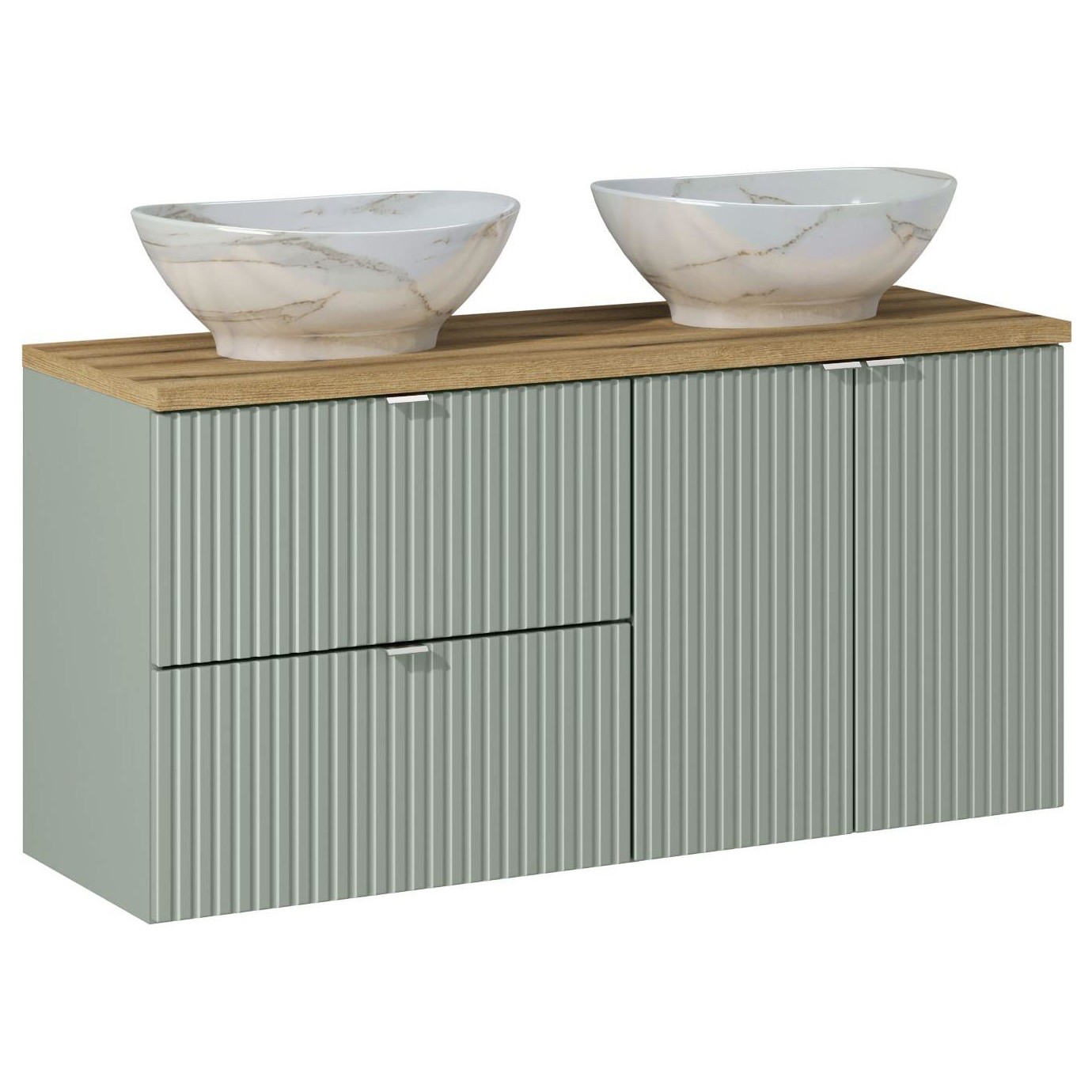 Prezentowana kolekcja mebli to propozycja, która łączy nowoczesny design z klasyczną elegancją. Wykorzystanie poziomych frezowań na frontach, znanych również jako ryflowanie, nadaje meblom wyjątkowego charakteru, wprowadzając ruch i płynność do każdego wnętrza łazienki.Ten wyjątkowy odcień zieleni wprowadza do łazienki atmosferę spokoju i relaksu, tworząc przestrzeń, w której każdy detal ma znaczenie. Meble nie tylko upiększają łazienkę, ale także zwiększają jej funkcjonalność, oferując praktyczne rozwiązania przechowywania i elastyczność w aranżacji przestrzeni. Dzięki wysokiej jakości materiałom i precyzyjnemu wykonaniu, przedstawiona kolekcja mebli gwarantuje trwałość i niezawodność na lata.