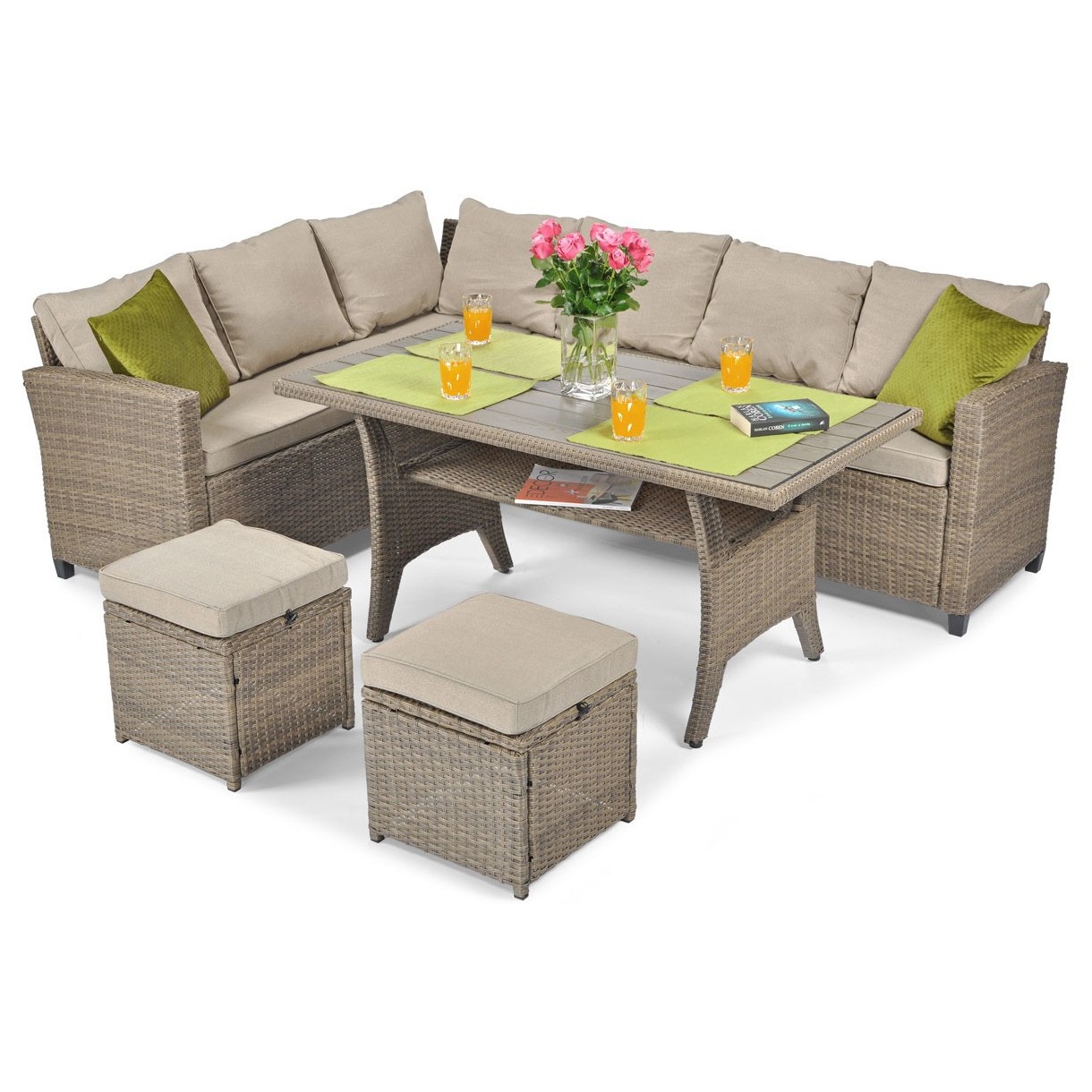 Zestaw mebli ogrodowych SZTOKHOLM PLUS to eleganckie i praktyczne rozwiązanie do każdej przestrzeni zewnętrznej – ogrodu, tarasu czy balkonu. W skład kompletu wchodzi narożnik, prostokątny stół oraz dwie funkcjonalne pufy, które można wykorzystać jako siedziska lub podnóżki. Konstrukcja wykonana z wytrzymałego technorattanu zapewnia odporność na warunki atmosferyczne i łatwość czyszczenia. Stabilny stół z eleganckim blatem idealnie sprawdza się podczas spotkań przy kawie lub posiłkach na świeżym powietrzu. Nowoczesny design zestawu łączy estetykę z komfortem, tworząc przytulną strefę wypoczynkową. To doskonały wybór dla osób ceniących styl, trwałość i wygodę.
