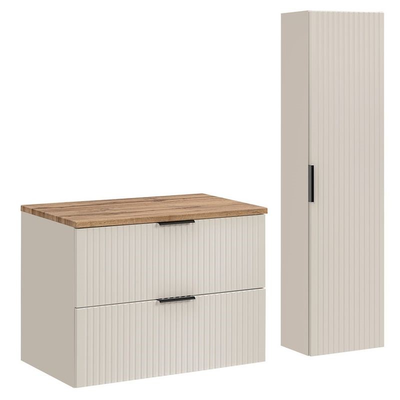 Zestaw meblowy o szerokości 80 cm z dopasowaną szafką wysoką to kompletny i funkcjonalny zestaw do każdej łazienki. Szafka podumywalkowa z szerokim blatem zapewnia wygodne miejsce do ustawienia umywalki nablatowej lub akcesoriów, a dodatkowy słupek ułatwia organizację przestrzeni – doskonały na ręczniki, środki czystości czy kosmetyki. Zestaw został zaprojektowany z myślą o ergonomii i estetyce: elegancka forma, nowoczesne wykończenia oraz ciche domykanie frontów to gwarancja komfortu i trwałości. Idealny wybór do średnich i większych łazienek, gdzie liczy się zarówno styl, jak i praktyczność.