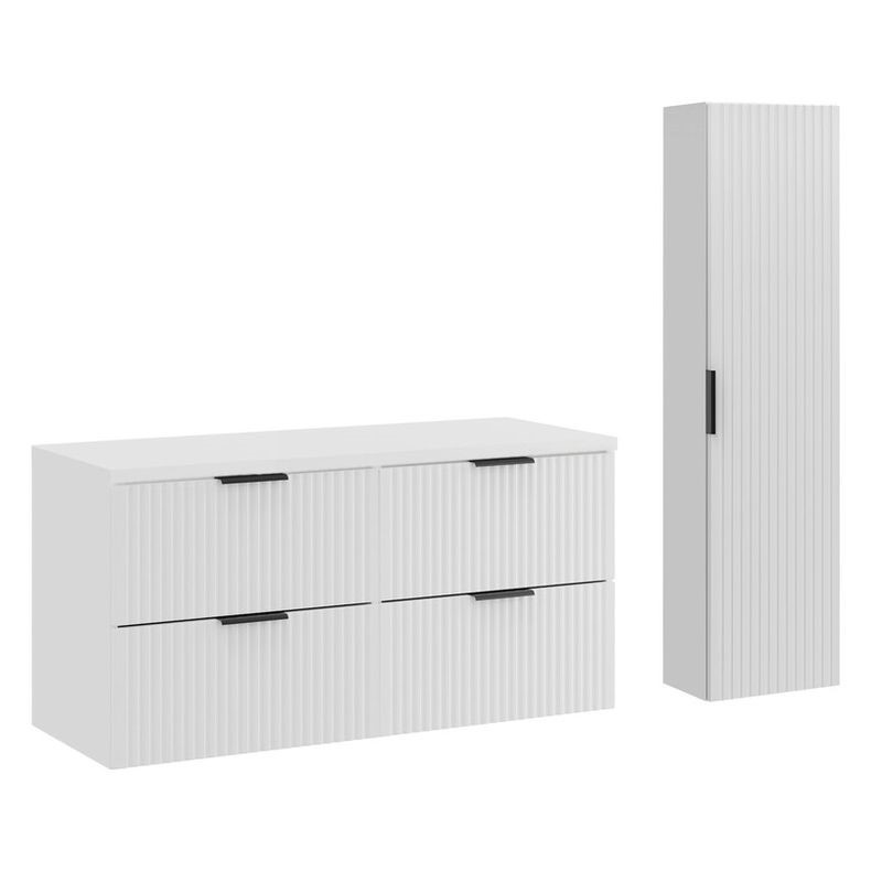 Zestaw meblowy 120 cm z szafką wysoką to eleganckie i funkcjonalne rozwiązanie do przestronnych łazienek. Prosta bryła i jednolite wykończenie tworzą nowoczesny, spójny wizualnie zestaw. Szeroki blat zapewnia dużo miejsca na przechowywanie akcesoriów lub montaż umywalki nablatowej, a dołączona szafka wysoka pozwala na wygodne uporządkowanie przestrzeni. Ciche domykanie, estetyczne detale i jakość materiałów sprawiają, że zestaw jest nie tylko praktyczny, ale i trwały.