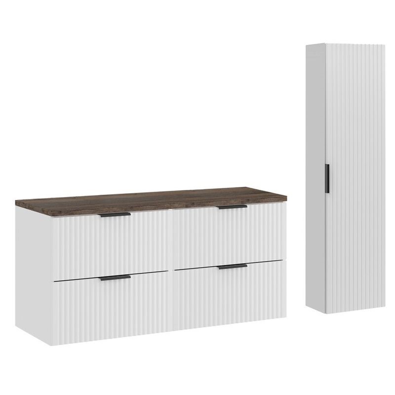 Zestaw meblowy 120 cm z szafką wysoką to eleganckie i funkcjonalne rozwiązanie do przestronnych łazienek. Prosta bryła i jednolite wykończenie tworzą nowoczesny, spójny wizualnie zestaw. Szeroki blat zapewnia dużo miejsca na przechowywanie akcesoriów lub montaż umywalki nablatowej, a dołączona szafka wysoka pozwala na wygodne uporządkowanie przestrzeni. Ciche domykanie, estetyczne detale i jakość materiałów sprawiają, że zestaw jest nie tylko praktyczny, ale i trwały.