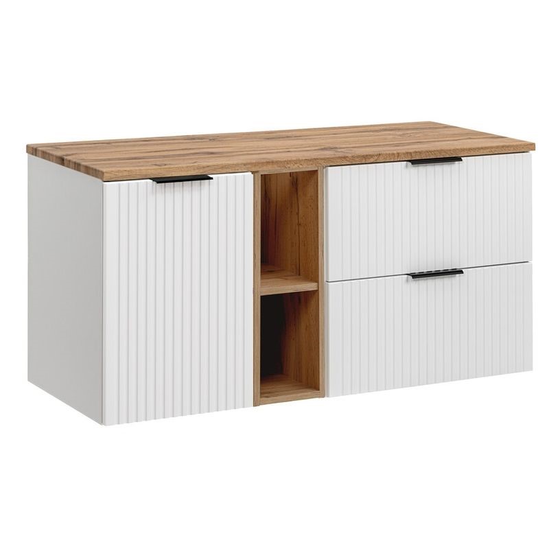 Zestaw meblowy 140 cm z szerokim blatem to funkcjonalna i elegancka baza do stworzenia przestronnej strefy umywalkowej. Blat daje możliwość dowolnej aranżacji – od pojedynczej umywalki nablatowej po podwójną, co zwiększa elastyczność użytkowania. Minimalistyczna forma i staranne wykonanie sprawiają, że zestaw doskonale sprawdzi się zarówno w klasycznych, jak i nowoczesnych łazienkach. To solidne i estetyczne rozwiązanie dla wymagających użytkowników.