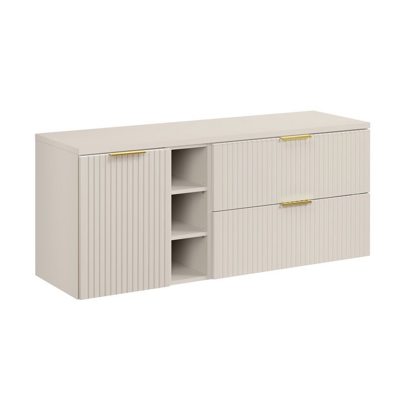 Zestaw meblowy 140 cm z szerokim blatem to funkcjonalna i elegancka baza do stworzenia przestronnej strefy umywalkowej. Blat daje możliwość dowolnej aranżacji – od pojedynczej umywalki nablatowej po podwójną, co zwiększa elastyczność użytkowania. Minimalistyczna forma i staranne wykonanie sprawiają, że zestaw doskonale sprawdzi się zarówno w klasycznych, jak i nowoczesnych łazienkach. To solidne i estetyczne rozwiązanie dla wymagających użytkowników.