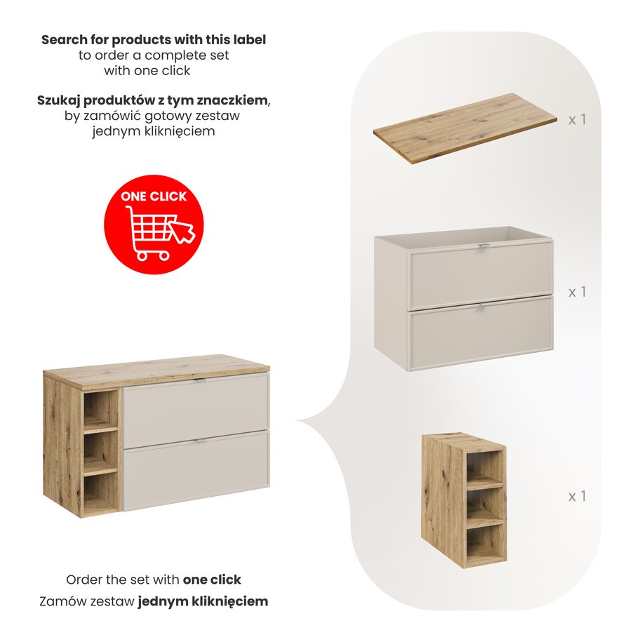 Zestaw meblowy o szerokości 100 cm to klasyczna i elegancka baza do samodzielnej aranżacji łazienki. Kolorystyka doskonale komponuje się z różnymi typami umywalek nablatowych. Wysokiej jakości materiały oraz przemyślana konstrukcja sprawiają, że mebel jest trwały, praktyczny i wyjątkowo estetyczny.