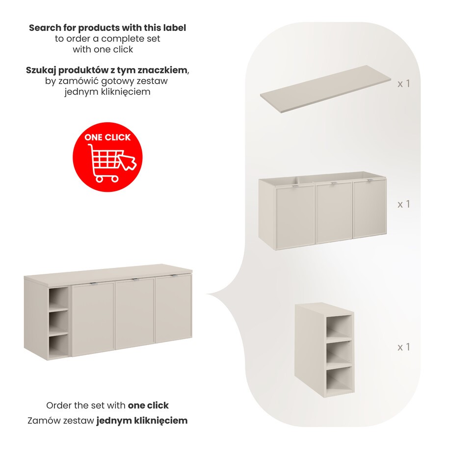 Zestaw meblowy 140 cm z szerokim blatem to funkcjonalna i elegancka baza do stworzenia przestronnej strefy umywalkowej. Blat daje możliwość dowolnej aranżacji – od pojedynczej umywalki nablatowej po podwójną, co zwiększa elastyczność użytkowania. Minimalistyczna forma i staranne wykonanie sprawiają, że zestaw doskonale sprawdzi się zarówno w klasycznych, jak i nowoczesnych łazienkach. To solidne i estetyczne rozwiązanie dla wymagających użytkowników.