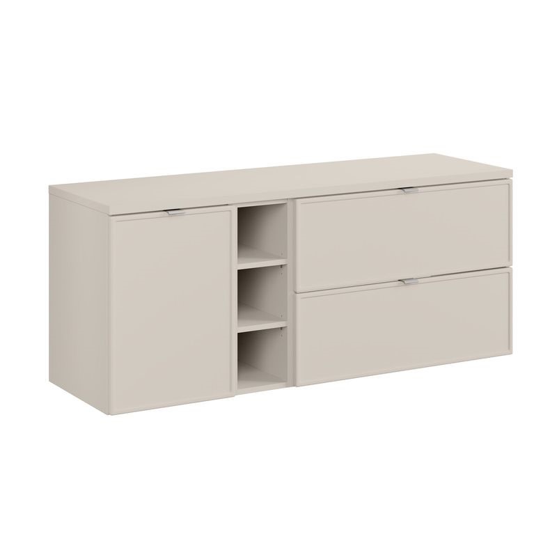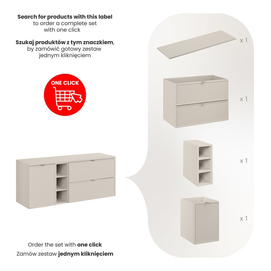 Zestaw meblowy 140 cm z szerokim blatem to funkcjonalna i elegancka baza do stworzenia przestronnej strefy umywalkowej. Blat daje możliwość dowolnej aranżacji – od pojedynczej umywalki nablatowej po podwójną, co zwiększa elastyczność użytkowania. Minimalistyczna forma i staranne wykonanie sprawiają, że zestaw doskonale sprawdzi się zarówno w klasycznych, jak i nowoczesnych łazienkach. To solidne i estetyczne rozwiązanie dla wymagających użytkowników.