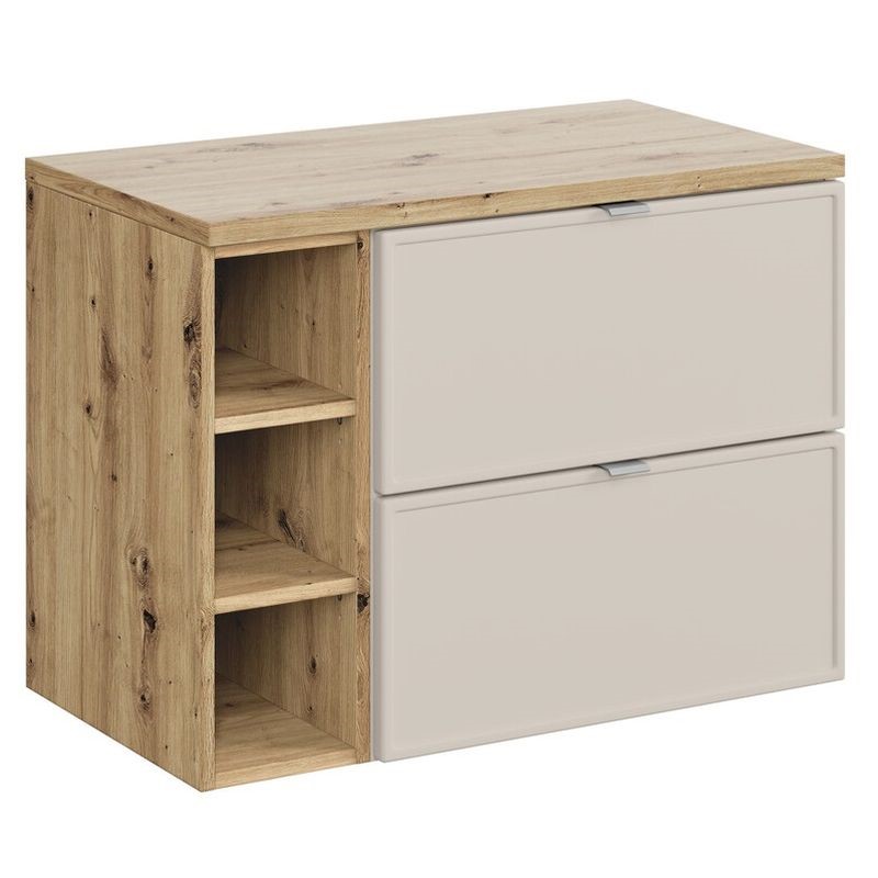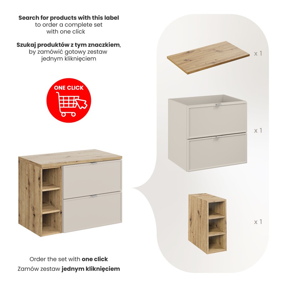 Zestaw meblowy CREMONA 80 cm to propozycja dla osób ceniących czystość formy i wygodę użytkowania. Kompaktowy, a zarazem pojemny, idealnie odnajduje się w mniejszych przestrzeniach, oferując jednocześnie funkcjonalną powierzchnię blatu. Subtelne linie i wyważone proporcje nadają wnętrzu elegancji, tworząc doskonałe tło dla umywalki nablatowej.