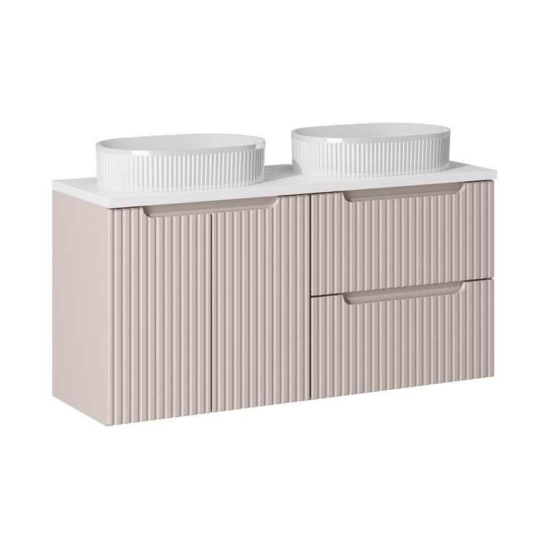 Zestawy meblowe Beyond o szerokości 120 i 140 cm, z dwiema umywalkami nablatowymi i w wariancie z szafką wysoką, to kompleksowe wyposażenie do dużych łazienek. Dzięki szerokiemu blatowi i podwójnym umywalkom oferują wygodę użytkowania dla dwóch osób jednocześnie. Wersja 140 cm z dodatkową szafką wysoką zapewnia jeszcze więcej przestrzeni do przechowywania. Stylowa, nowoczesna forma mebli i wysoka jakość wykończenia sprawiają, że zestawy nie tylko świetnie wyglądają, ale i służą przez lata.