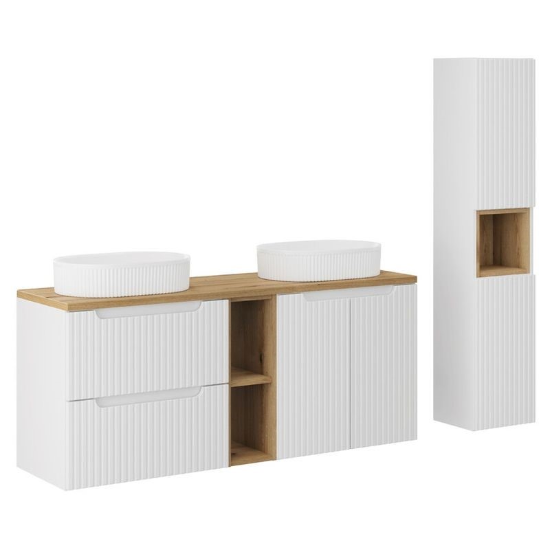 Imponujący zestaw meblowy o szerokości 140 cm z dwoma umywalkami nablatowymi Beyond i szafką wysoką to rozwiązanie dla tych, którzy cenią sobie maksymalny komfort i przestrzeń. Nowoczesne wzornictwo, funkcjonalny układ oraz duża ilość miejsca do przechowywania sprawiają, że zestaw ten sprawdzi się idealnie w rodzinnych łazienkach lub przestronnych wnętrzach. Umywalki Beyond to nie tylko stylowy akcent, ale też wygoda użytkowania, a szafka wysoka pozwoli uporządkować wszystkie niezbędne akcesoria.