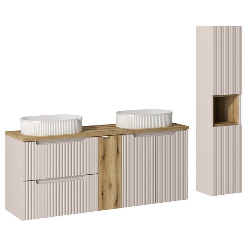 Imponujący zestaw meblowy o szerokości 140 cm z dwoma umywalkami nablatowymi Beyond i szafką wysoką to rozwiązanie dla tych, którzy cenią sobie maksymalny komfort i przestrzeń. Nowoczesne wzornictwo, funkcjonalny układ oraz duża ilość miejsca do przechowywania sprawiają, że zestaw ten sprawdzi się idealnie w rodzinnych łazienkach lub przestronnych wnętrzach. Umywalki Beyond to nie tylko stylowy akcent, ale też wygoda użytkowania, a szafka wysoka pozwoli uporządkować wszystkie niezbędne akcesoria.