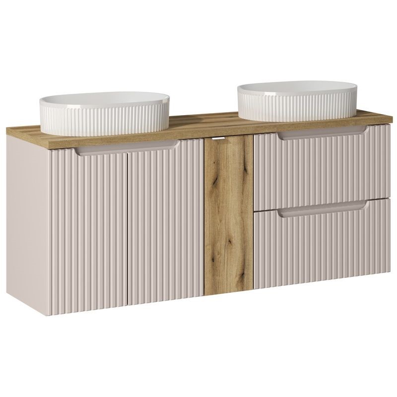 Zestaw łazienkowy o szerokości 140 cm z umywalkami nablatowymi Beyond to świetne rozwiązanie dla większych łazienek. Blat zapewnia przestrzeń roboczą dla dwóch osób, a duże szuflady gwarantują wygodne przechowywanie akcesoriów. Wykończenie nadaje wnętrzu ciepła i nowoczesnej elegancji.
