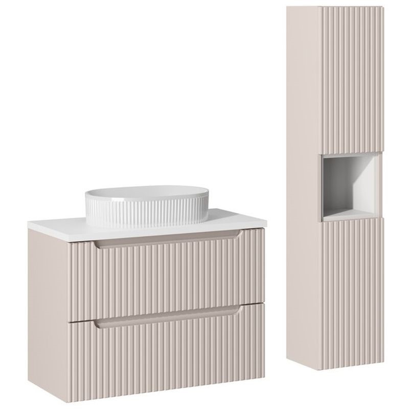 Nowoczesny zestaw łazienkowy o szerokości 80 cm z umywalką nablatową Beyond i szafką wysoką to wygodna propozycja dla osób ceniących estetykę i porządek. Blat oferuje przestrzeń do codziennych czynności, a dodatkowa szafka pozwala na uporządkowane przechowywanie kosmetyków czy ręczników. Subtelna forma zestawu świetnie komponuje się z różnymi aranżacjami wnętrz.
