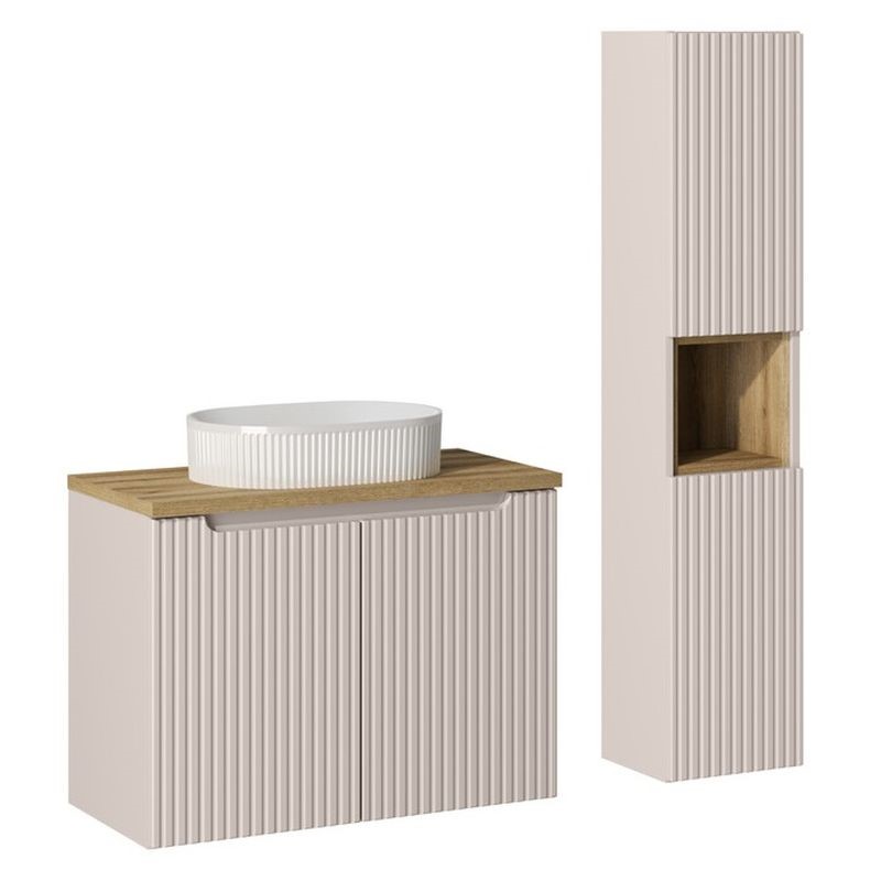 Ten zestaw meblowy z umywalką nablatową Beyond oraz wysoką szafką wnosi do wnętrza spokój i funkcjonalność. Harmonijnie łączy nowoczesne wzornictwo z naturalnymi akcentami. Blat zapewnia wygodną przestrzeń użytkową, a dodatkowe miejsce do przechowywania pozwala zachować porządek bez rezygnacji z estetyki.