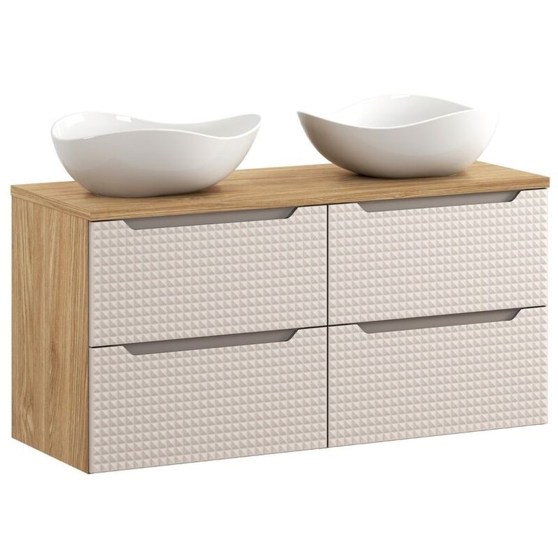 Zestaw łazienkowy z dwoma umywalkami nablatowymi Cloud zapewnia komfort korzystania z łazienki przez dwie osoby jednocześnie. Duża powierzchnia blatu oraz przestrzeń pod umywalkami ułatwiają organizację. Elegancka forma i współczesne wzornictwo tworzą spójną, atrakcyjną wizualnie całość, pasującą do nowoczesnych wnętrz.