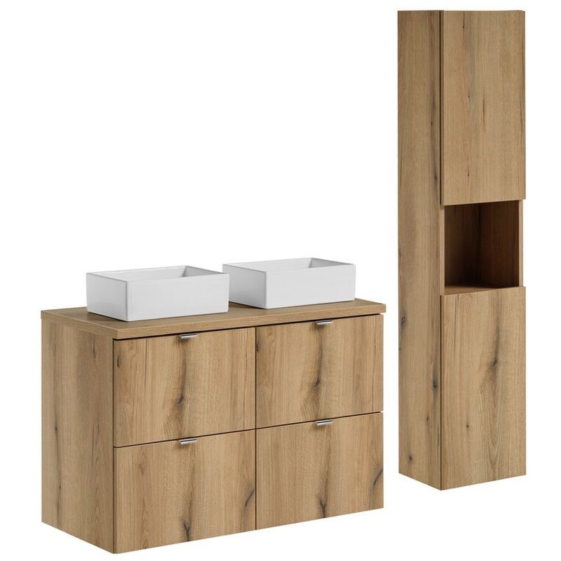 Zestaw meblowy z dwiema umywalkami nablatowymi Gaja i dodatkową szafką wysoką zapewnia maksymalną wygodę i przestrzeń do przechowywania. Praktyczna forma oraz eleganckie wykończenie sprawiają, że mebel świetnie odnajduje się zarówno w klasycznych, jak i nowoczesnych aranżacjach. Idealny dla osób ceniących porządek i wygodę.
