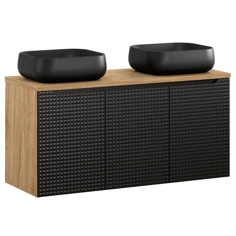 Zestaw meblowy o szerokości 120 cm z dwiema umywalkami nablatowymi Nika to rozwiązanie idealne do nowoczesnej łazienki rodzinnej lub przestronnej strefy kąpielowej. Minimalistyczny design i kontrastowe wykończenie podkreślają nowoczesny charakter mebla, a podwójna funkcjonalność zapewnia wygodę użytkowania na co dzień.