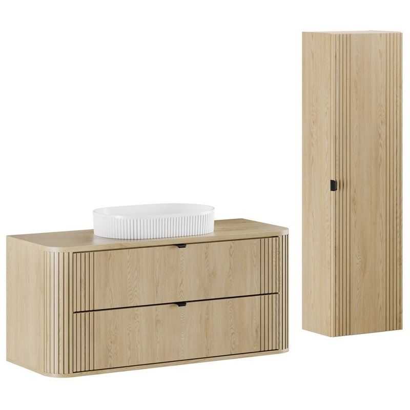 Zestaw meblowy z umywalką OVALIA to kompleksowe rozwiązanie do łazienki, łączące funkcjonalność z nowoczesnym designem. Składa się z pojemnych szafek dolnych i wysokich idealnie dopasowanych do umywalki nablatowej lub meblowej, co zapewnia wygodę i estetykę. Przemyślane rozwiązania do przechowywania pomagają utrzymać porządek, a minimalistyczna forma wpisuje się w różne style wnętrz. To idealny wybór dla osób szukających gotowego, spójnego zestawu.