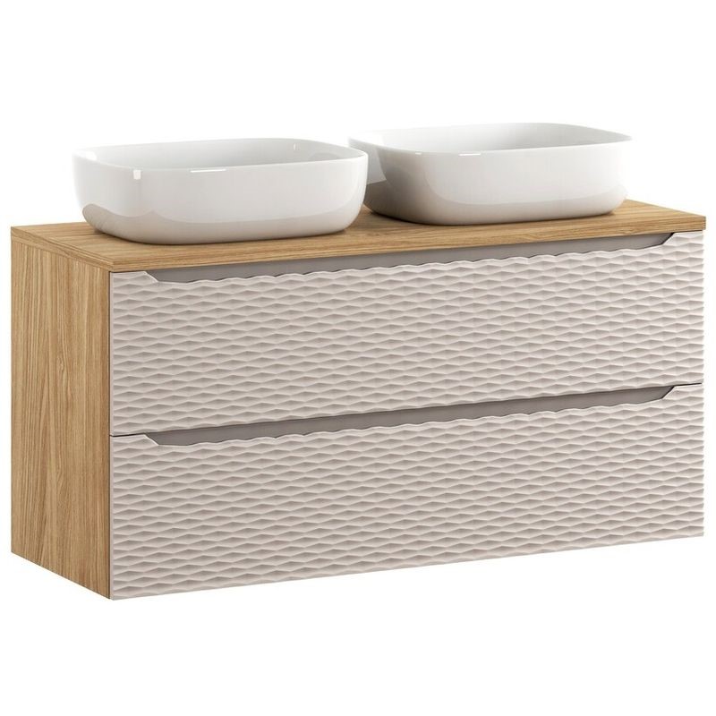 Zestaw 120 cm z dwiema umywalkami nablatowymi Smile to połączenie funkcjonalności i stylu. Umożliwia wygodne korzystanie przez dwie osoby, a pojemna szafka pomaga utrzymać porządek. Minimalistyczny design sprawia, że mebel pasuje do wielu nowoczesnych aranżacji.