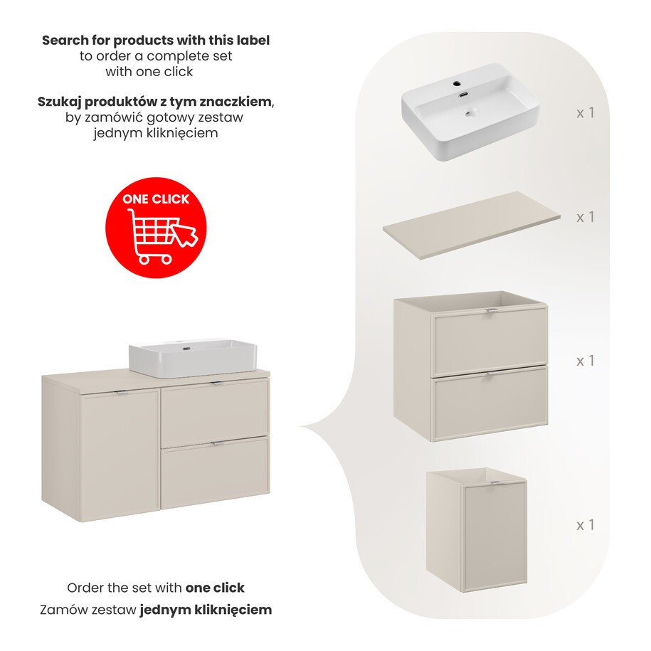 Zestaw meblowy z umywalką nablatową Trust i praktycznym blatem to nowoczesna propozycja dla osób ceniących przemyślane rozwiązania. Zapewnia odpowiednio dużą powierzchnię roboczą oraz wygodne miejsce do przechowywania łazienkowych niezbędników. Subtelna, elegancka forma mebla świetnie wpisuje się w aktualne trendy wnętrzarskie, nadając przestrzeni harmonii i ładu.