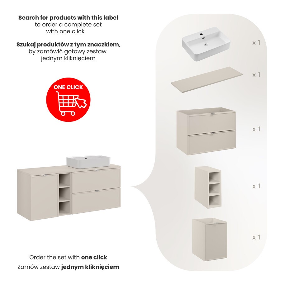 Zestaw meblowy 140 cm z blatem i umywalką nablatową Trust to połączenie nowoczesnego designu z naturalną estetyką. Meble w kolorach cashmere lub artisan wprowadzają do wnętrza ciepło i przytulność, a jednocześnie zachowują elegancki charakter. Blat tworzy solidną bazę pod ceramiczną umywalkę, a szuflady zapewniają przestrzeń do przechowywania codziennych akcesoriów. Geometryczna forma i subtelne uchwyty nadają zestawowi lekkości, a wysokiej jakości materiały gwarantują jego trwałość i odporność na wilgoć.