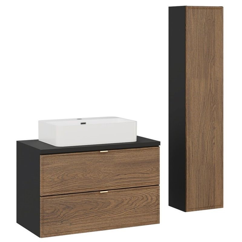 Zestaw łazienkowy z umywalką nablatową Trust i wysoką szafką to połączenie funkcjonalności i wyrazistego stylu. Ciemna kolorystyka nadaje mu charakteru, a przemyślany układ szafek pozwala na wygodne przechowywanie. Idealna propozycja dla osób, które szukają mebli praktycznych, a jednocześnie oryginalnych.