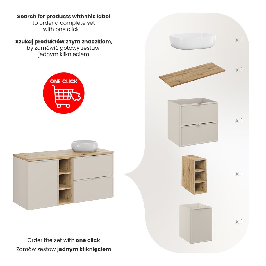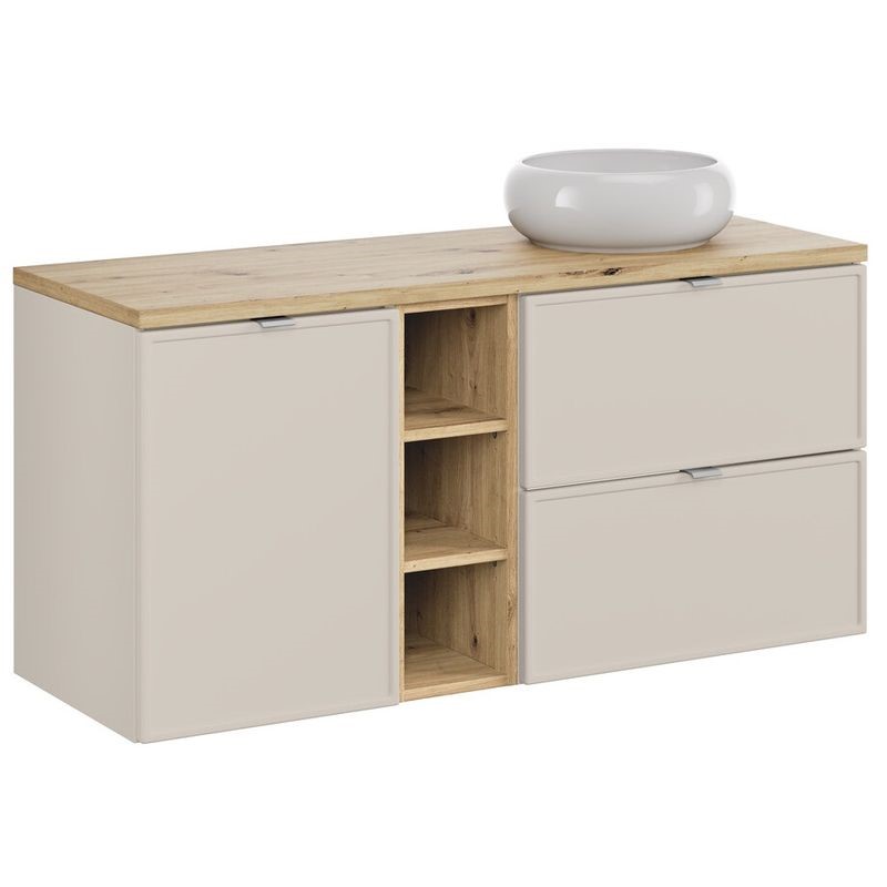 Zestaw meblowy z umywalką nablatową Wiki i blatem 120 cm zapewnia swobodę użytkowania i dużą przestrzeń roboczą. Szafka została zaprojektowana z myślą o codziennej wygodzie, oferując sporo miejsca do przechowywania. Umiarkowany design wprowadza do wnętrza harmonię i lekkość.