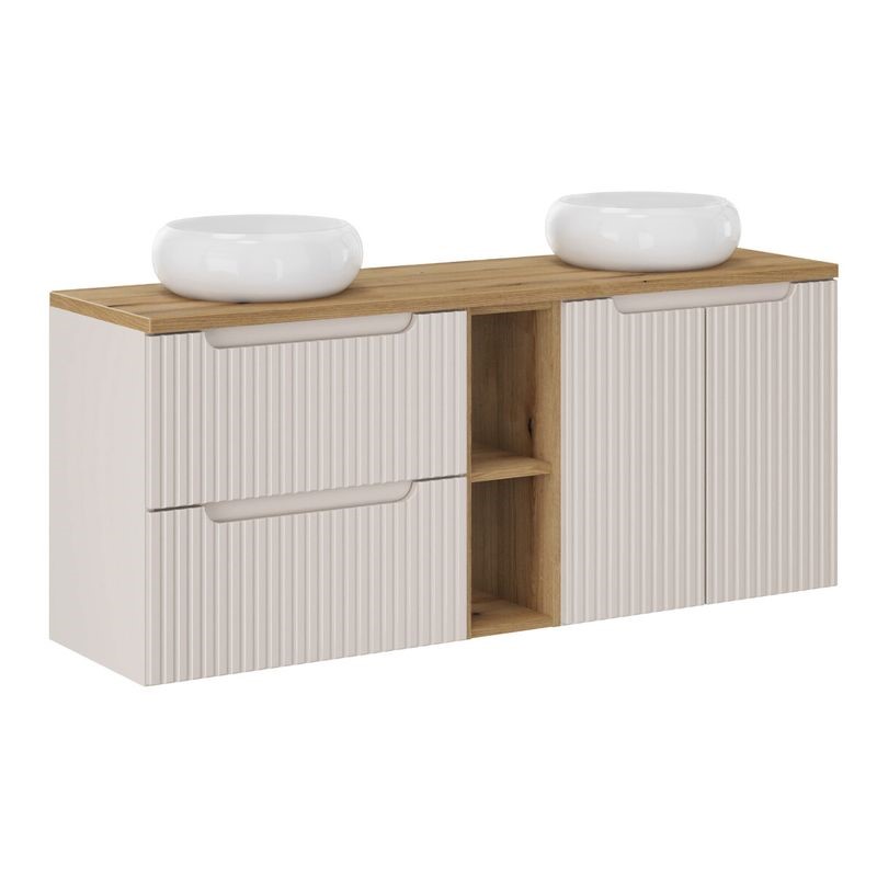 Zestaw łazienkowy z dwiema umywalkami nablatowymi Wiki to komfortowe rozwiązanie dla większych rodzin lub par. Przemyślana konstrukcja mebla oferuje odpowiednią ilość przestrzeni do codziennego użytku i przechowywania. Nowoczesna forma podkreślona klasycznymi akcentami sprawia, że łazienka zyskuje wyrafinowany charakter.