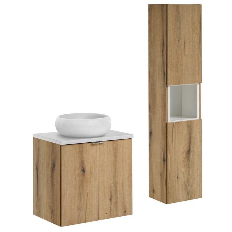 Zestaw meblowy o szerokości 60 cm z umywalką nablatową Wiki i wysoką szafką to idealne rozwiązanie dla mniejszych łazienek, w których liczy się każdy centymetr. Blat o estetycznym wykończeniu zapewnia trwałość i odporność na działanie wilgoci, a kompaktowa szafka z szufladami pozwala uporządkować codzienne akcesoria. Uzupełnieniem kompletu jest funkcjonalna szafka wysoka, która zapewnia dodatkowe miejsce do przechowywania kosmetyków, ręczników czy środków czystości. Umywalka nablatowa Wiki dodaje całości nowoczesnego charakteru, a całość zachowana jest w ponadczasowej estetyce, która sprawdzi się zarówno w nowoczesnych, jak i bardziej klasycznych wnętrzach.