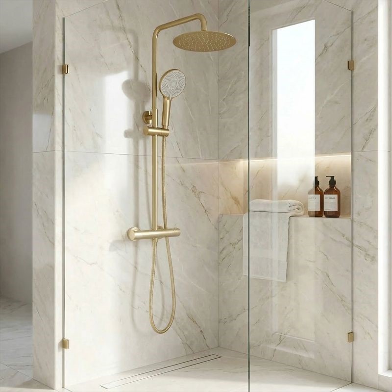 Zestaw natryskowy LUNGO z baterią termostatyczną to nowoczesne i wygodne rozwiązanie do każdej łazienki. Dzięki zastosowaniu termostatu użytkownik może utrzymać stałą temperaturę wody, co znacząco podnosi komfort i bezpieczeństwo podczas kąpieli. Minimalistyczny design oraz różnorodność wykończeń pozwalają dopasować zestaw do wielu stylów aranżacyjnych – od klasycznych po nowoczesne. Wysokiej jakości materiały zapewniają odporność na wilgoć, korozję i codzienne użytkowanie. Konstrukcja bez wylewki sprawia, że zestaw idealnie sprawdzi się w strefie prysznicowej. To praktyczne i estetyczne rozwiązanie dla wymagających użytkowników.