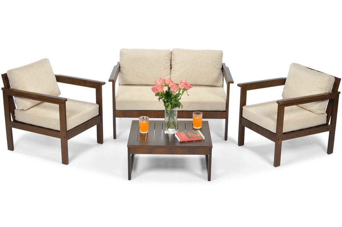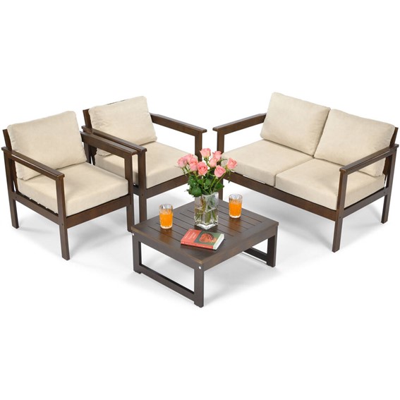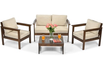 Zestaw ogrodowy "Bella" dla 4 osób, w kolorystyce brązowej z beżowymi poduszkami, to elegancka i funkcjonalna opcja do użytku na zewnątrz. Komplet składa się z jednego stołu oraz czterech krzeseł z wygodnymi, beżowymi poduszkami, które zapewniają komfort siedzenia. Meble wykonane z trwałych materiałów są odporne na warunki atmosferyczne, idealne na taras, do ogrodu czy na patio. Estetyczne połączenie brązowego koloru mebli z beżowymi akcentami dodaje przestrzeni ciepłego i przyjemnego charakteru, sprzyjającego relaksowi i spotkaniom w gronie rodziny czy przyjaciół.