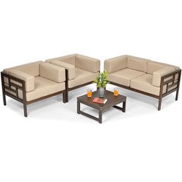 Stylowy design zestawu łączy brązowy i beżu kolor, tworząc nowoczesny i uniwersalny wygląd, który doskonale komponuje się z różnymi aranżacjami ogrodowymi. Zestaw składa się z wygodnej sofy, dwóch foteli, dwóch podnóżków i praktycznego stolika, zapewniając maksymalny komfort i funkcjonalność.