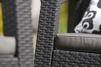 Komplet dwóch foteli ogrodowych CORFU DUO, 2-osobowy komplet ogrodowy z poduszkami. Zestaw składa się z dwóch wygodnych foteli, idealnych na taras, balkon lub taras. W zestawie znajdują się również dwie poduszki na siedzisko wraz z pokrowcami na zamek błyskawiczny. Fotel ogrodowy CORFU ma oryginalny i nowoczesny wygląd. Jego powierzchnię zdobi elegancka faktura imitująca rattan. Głębokie siedzisko, miękka poduszka i wyprofilowane oparcie zapewniają komfort podczas siedzenia. Meble wykonane są z tworzywa sztucznego, które charakteryzuje się dużą odpornością na wodę, słońce i niekorzystne warunki atmosferyczne. Są łatwe w czyszczeniu, a dzięki mocnej konstrukcji krzesło wytrzymuje obciążenie do 100 kg.