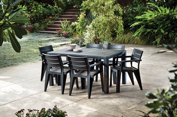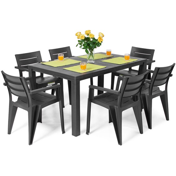 Komplet ogrodowy składający się z stołu i krzeseł Julie 6-osobowy w odcieniu grafitowym to idealne rozwiązanie dla tych, którzy pragną połączenia funkcjonalności, elegancji i wygody w swoim ogrodowym otoczeniu. Wykonany z wysokiej jakości materiałów, zestaw ten nie tylko prezentuje się stylowo, ale także jest odporan na warunki atmosferyczne, gwarantując trwałość i niezawodność przez wiele sezonów. Stół, otoczony przez wygodne krzesła, tworzy przestronną przestrzeń do rodzinnych posiłków czy letnich spotkań ze znajomymi. Kolor grafitowy nadaje kompletowi nowoczesny charakter, który doskonale komponuje się z różnymi aranżacjami ogrodowymi.