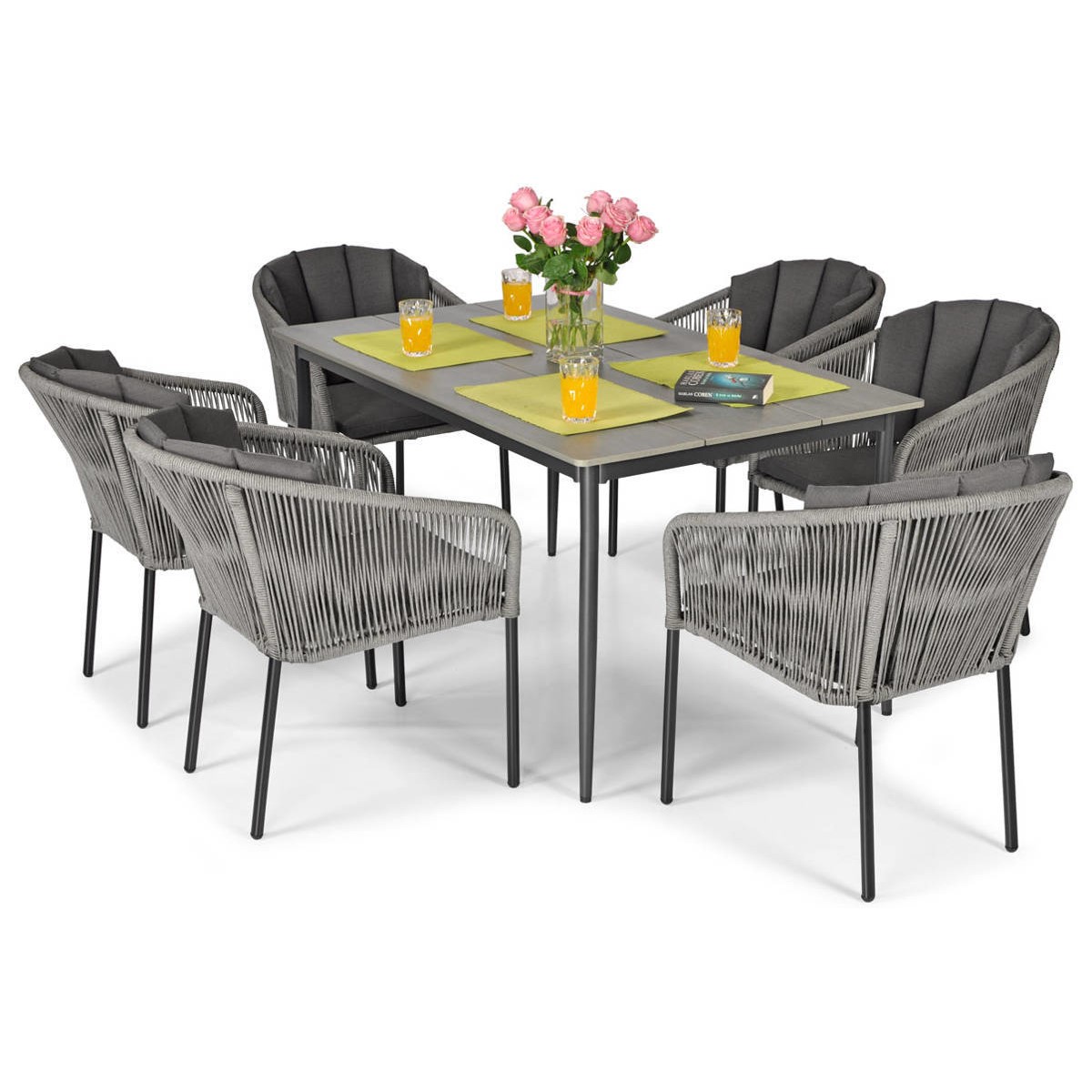 Duży zestaw ogrodowy VICTORIA to elegancki i funkcjonalny zestaw, który wniesie przytulność i styl do Twojego ogrodu lub tarasu. Składa się z ośmiu wygodnych foteli i dużego stołu jadalnego. Idealnie sprawdzi się podczas rodzinnych spotkań, przyjęć i wypoczynku na świeżym powietrzu. Zestaw naczyń ogrodowych dla 6 osób zachwyca oryginalnym wyglądem i nowoczesnym designem. Zestaw ogrodowy składa się z ośmiu wygodnych, nowoczesnych foteli, które stoją na szarej, stalowej ramie malowanej proszkowo, co zapewnia idealne pokrycie powierzchni i równomierne rozłożenie kolorów. Tył krzesła jest ciasno tkany atrakcyjnym szarym nylonowym sznurkiem. Podobnie gęsto tkane siedzisko (tkanina w kratkę) posiada wygodną, miękką wyściółkę, która w połączeniu z konstrukcją krzesła zapewnia wygodę użytkowania nawet podczas długich bankietów. Kolejnym atutem tego pięknego krzesła jest wyprofilowana poduszka na oparciu. Poduszka oparcia jest gustownie uszyta pionowo i podobnie jak poduszka siedziska jest w kolorze szarym. Drugim elementem mebli ogrodowych VICTORIA jest duży stół BOSANO o wymiarach 150 x 89,5 cm, idealny dla 6 osób. Stół stoi na aluminiowej ramie malowanej proszkowo w kolorze czarnym. Blat tego stołu do jadalni na świeżym powietrzu wykonany jest z trzech szerokich, ciemnoszarych paneli kompozytowych.