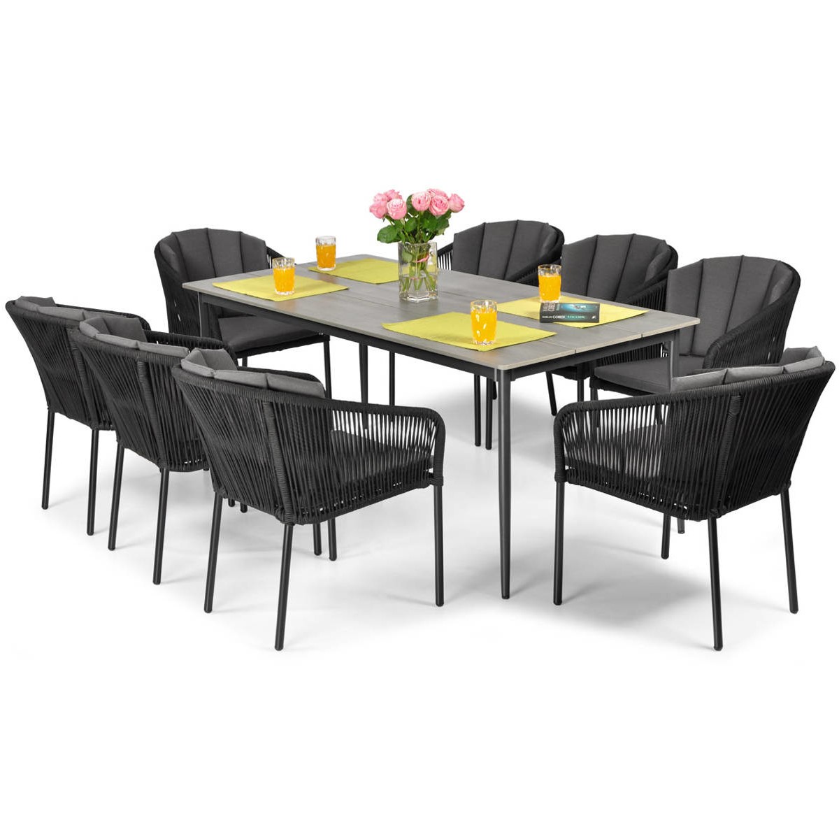 <p><strong>• 2 lata gwarancji</strong></p> <p><strong>• Krzesło 61x73x81</strong></p> <p><strong>• Stół 74,5x90x180</strong></p> <p> </p> <p>Duży zestaw ogrodowy VICTORIA to elegancki i funkcjonalny zestaw, który wniesie przytulność i styl do Twojego ogrodu lub tarasu. Składa się z ośmiu wygodnych foteli i dużego stołu jadalnego. Idealnie sprawdzi się podczas rodzinnych spotkań, przyjęć i wypoczynku na świeżym powietrzu. Zestaw naczyń ogrodowych dla 8 osób zachwyca oryginalnym wyglądem i nowoczesnym designem. Zestaw ogrodowy składa się z ośmiu wygodnych, nowoczesnych foteli, które stoją na czarnej, stalowej ramie malowanej proszkowo, co zapewnia idealne pokrycie powierzchni i równomierne rozłożenie kolorów. Tył krzesła jest ciasno tkany atrakcyjnym czarnym nylonowym sznurkiem. Podobnie gęsto tkane siedzisko (tkanina w kratkę) posiada wygodną, miękką wyściółkę, która w połączeniu z konstrukcją krzesła zapewnia wygodę użytkowania nawet podczas długich bankietów. Kolejnym atutem tego pięknego krzesła jest wyprofilowana poduszka na oparciu. Poduszka oparcia jest gustownie uszyta pionowo i podobnie jak poduszka siedziska jest w kolorze szarym. Drugim elementem mebli ogrodowych VICTORIA jest duży stół BOSANO o wymiarach 180 x 90 cm, idealny dla 8 osób. Stół stoi na aluminiowej ramie malowanej proszkowo w kolorze czarnym. Blat tego stołu do jadalni na świeżym powietrzu wykonany jest z trzech szerokich, ciemnoszarych paneli kompozytowych.</p> <p> </p>