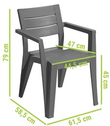 Duży zestaw ogrodowy dla 8 osób JULIE grafit to zestaw do zadań specjalnych. W skład zestawu wchodzą: stół ogrodowy JULIE DOUBLE dla dwóch osób oraz osiem foteli JULIE. Przemyślana, prosta konstrukcja stołu, jego stabilność i funkcjonalność to niepodważalne atuty. Takie zestawienie mebli z powodzeniem stosuje się na dużych tarasach iw ogrodach, co pozwala na organizację dużych przyjęć rodzinnych lub spotkań w licznym gronie przyjaciół. Zestaw mebli ogrodowych JULIE jest bardzo łatwy w montażu i nie wymaga specjalnego czyszczenia ani konserwacji. Charakteryzuje się dużą odpornością na uszkodzenia i warunki atmosferyczne. Posiada filtry UV, dzięki czemu meble wyglądają nieskazitelnie przez długi czas. Nowoczesny wygląd krzeseł JULIIE - industrialny styl, szerokie siedzisko i profilowane oparcie pozwalają na komfortowe użytkowanie krzesła przez długi czas. Możliwość sztaplowania krzeseł JULIE - ustawienie ich jedno na drugim pozwala zaoszczędzić miejsce podczas jesienno-zimowego przechowywania. Nośność krzesła wynosi 110 kg.
