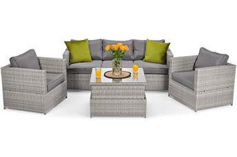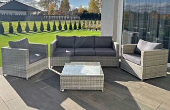 Zestaw mebli ogrodowych "Malaga Comfort Max" w kolorze szarym to nowoczesny i wysoce funkcjonalny wybór dla miłośników eleganckich, zewnętrznych aranżacji. Zestaw ten oferuje wyjątkowy komfort dzięki głębokim siedziskom i miękkim, odpornym na warunki atmosferyczne poduszkom. Składający się z modułowych kanap, które można dowolnie konfigurować, umożliwia optymalne dostosowanie do przestrzeni. Szara kolorystyka dodaje nowoczesności i łatwo wpasowuje się w różnorodne style ogrodowe, od nowoczesnych po bardziej tradycyjne. Zestaw "Malaga Comfort Max" to doskonała inwestycja w komfort i styl na wiele sezonów.