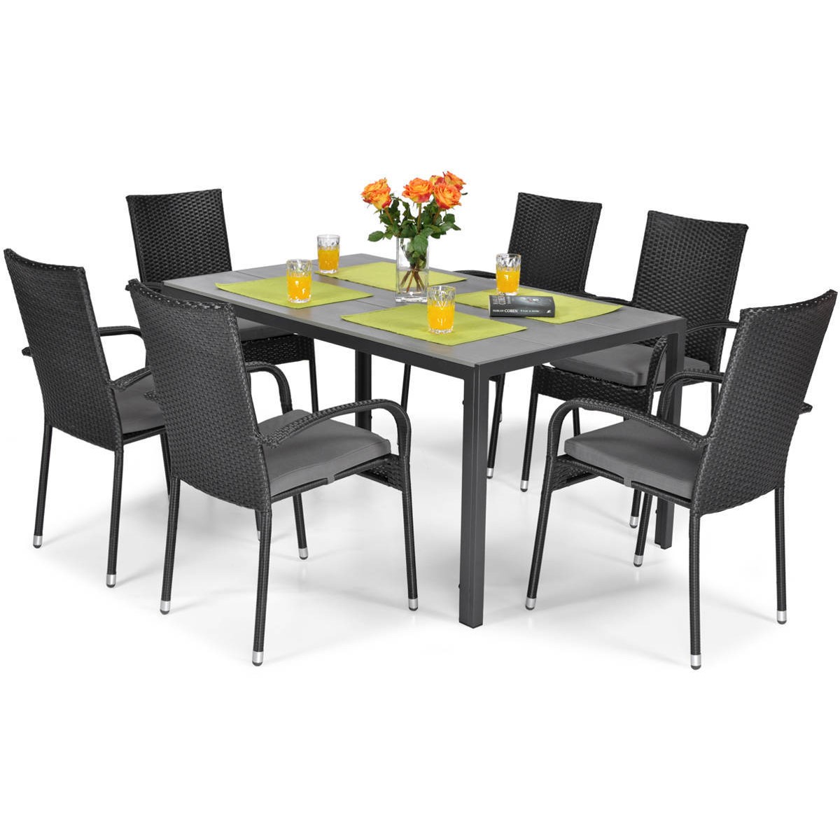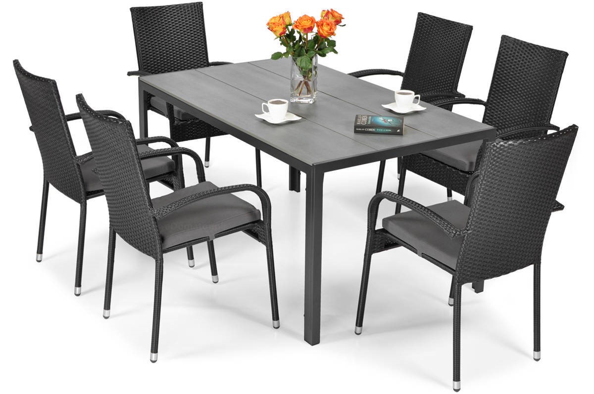 Zestaw mebli ogrodowych Malaga, składający się ze stołu i 6 krzeseł w kolorze czarnym, łączy nowoczesny design z funkcjonalnością, idealny dla każdego ogrodu, tarasu czy patio. Wykonany z materiałów odpornych na warunki atmosferyczne, zestaw gwarantuje trwałość i łatwość w utrzymaniu. Szary kolor dodaje elegancji, a ergonomicznie zaprojektowane krzesła z miękkimi poduszkami zapewniają komfort siedzenia, co czyni ten zestaw idealnym na długie spotkania towarzyskie i rodzinne obiady na świeżym powietrzu.