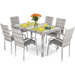 Zestaw mebli ogrodowych Malaga, składający się ze stołu i 6 krzeseł w kolorze szarym, łączy nowoczesny design z funkcjonalnością, idealny dla każdego ogrodu, tarasu czy patio. Wykonany z materiałów odpornych na warunki atmosferyczne, zestaw gwarantuje trwałość i łatwość w utrzymaniu. Szary kolor dodaje elegancji, a ergonomicznie zaprojektowane krzesła z miękkimi poduszkami zapewniają komfort siedzenia, co czyni ten zestaw idealnym na długie spotkania towarzyskie i rodzinne obiady na świeżym powietrzu.