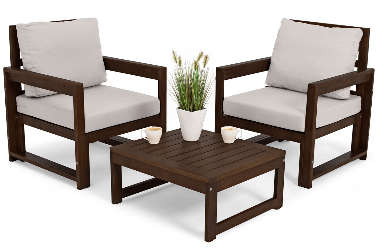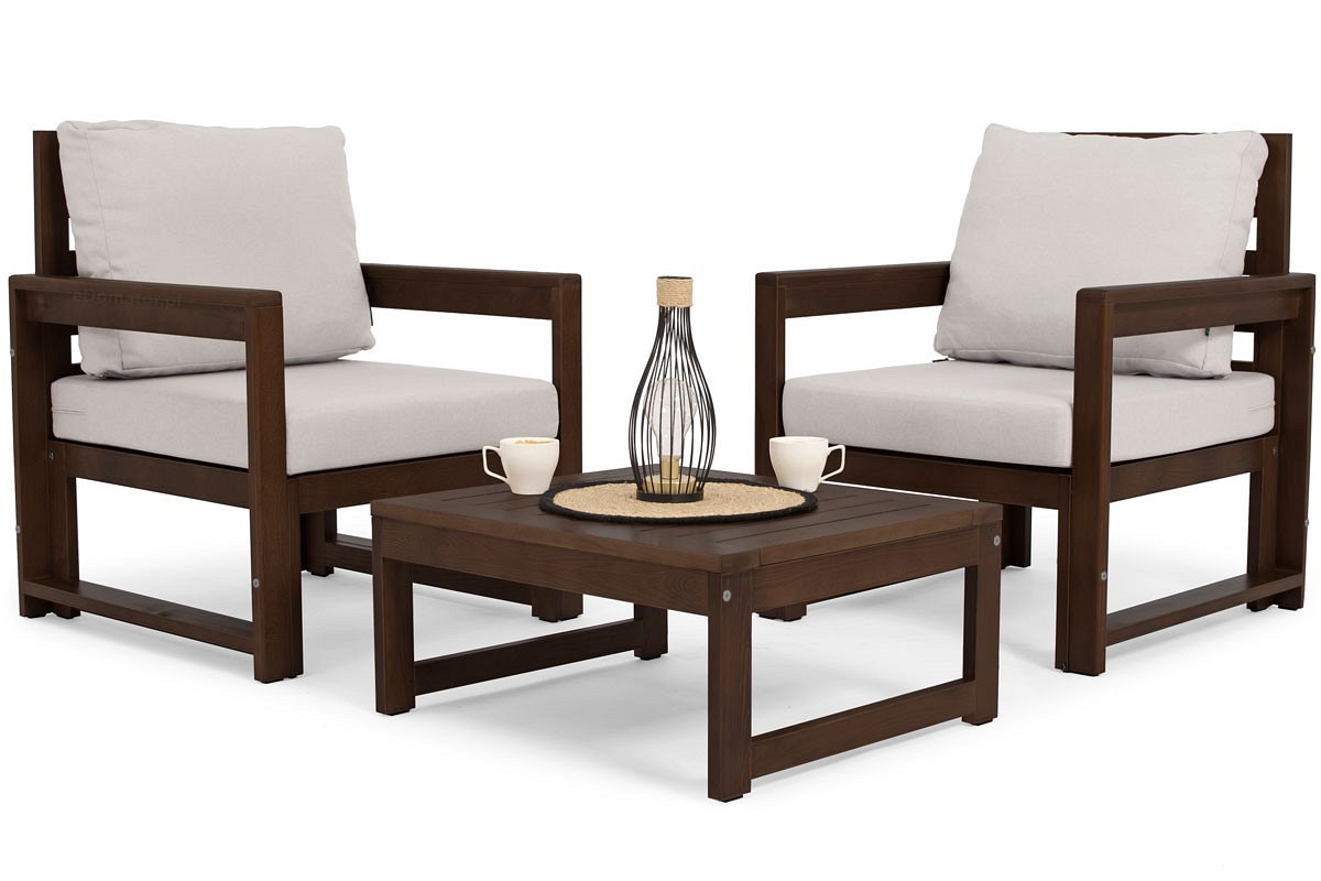 Jasnobrązowy drewniany zestaw ogrodowy MALTA o klasycznym kształcie dla 2 osób. W skład kompletu wchodzą dwa fotele i niski stolik kawowy, a krzesła i oparcie posiadają grube poduszki. Meble z naturalnego drewna są idealne do wnętrz boho i rustykalnych. Drewniane meble doskonale sprawdzą się w słonecznym ogrodzie, na tarasie czy balkonie. Funkcjonalne fotele są bardzo wygodne i stabilne, posiadają ryflowane siedziska, które nawet po zdjęciu poduszek wyglądają bardzo elegancko. Dopełnieniem zestawu jest niska ławka, która może służyć jako podnóżek. Ciemnobrązowe ramy dobrze komponują się z ciemnymi poduszkami. Konstrukcja jest bardzo wytrzymała dzięki minimalistycznemu kształtowi, dlatego maksymalne obciążenie jednego siedzenia to 120 kg. Meble MALTA wykonane są z wysokiej jakości drewna, impregnowanego i malowanego specjalną farbą odporną na warunki atmosferyczne i pleśń. Wyraźna struktura drewna nadaje niepowtarzalny charakter aranżacji balkonów, tarasów czy ogrodów.