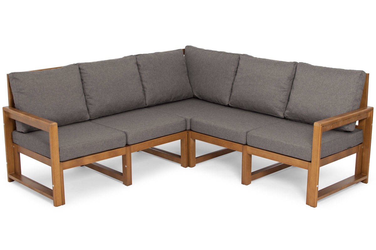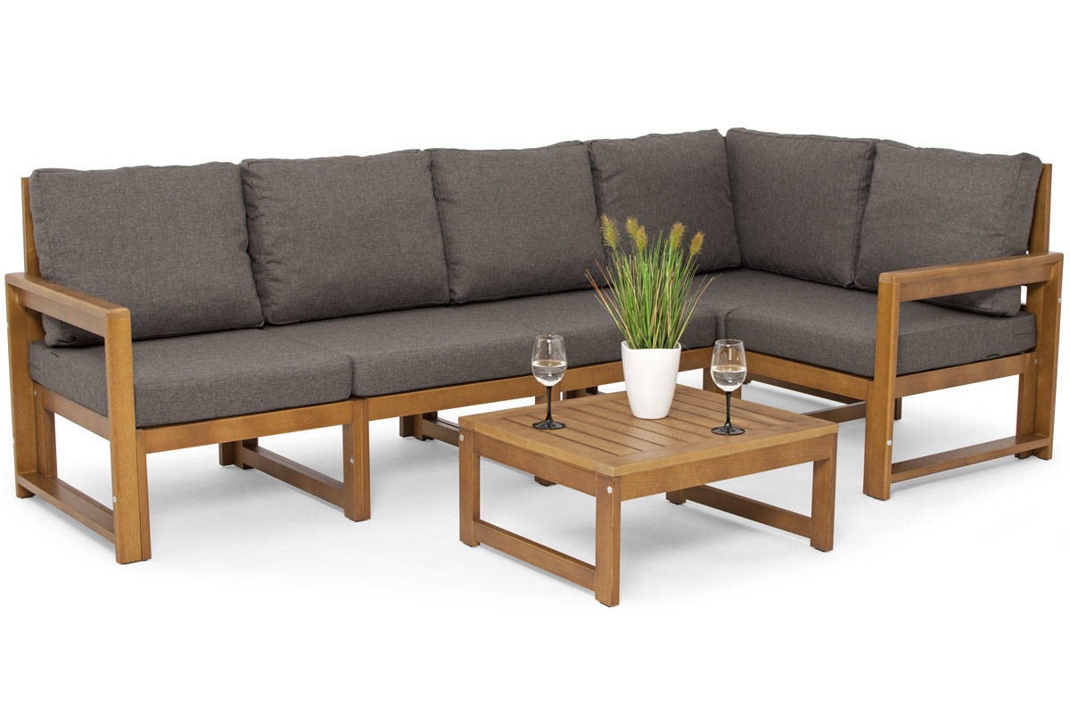 Minimalistyczny narożnik ogrodowy MALTA z stolikiem został zaprojektowany i wykonany w Polsce z najwyższej jakości materiałów. Drewniane meble ogrodowe charakteryzują się solidnym wykonaniem i dużą wytrzymałością. Sofa w stylu skandynawskim idealnie sprawdzi się na balkonie, tarasie czy w ogrodzie. Stelaż wykonany z drewna z certyfikatem FSC, które jest impregnowane, a następnie lakierowane, odporne na warunki atmosferyczne i pleśń. Drewniane meble ogrodowe z powodzeniem można ustawić w nasłonecznionym miejscu, ponieważ nie pogarsza to ich funkcji. Narożnik MALTA składa się z oddzielnych modułów, dzięki czemu można go dostosować do własnych potrzeb. W zależności od konfiguracji elementy serii mogą służyć do budowy narożników prawych lub lewych. Każda część składa się z szerokiego siedziska, oparcia i środkowych nóżek. W skład zestawu wchodzą moduły, moduł narożny, dwie podpory boczne oraz poduszka.