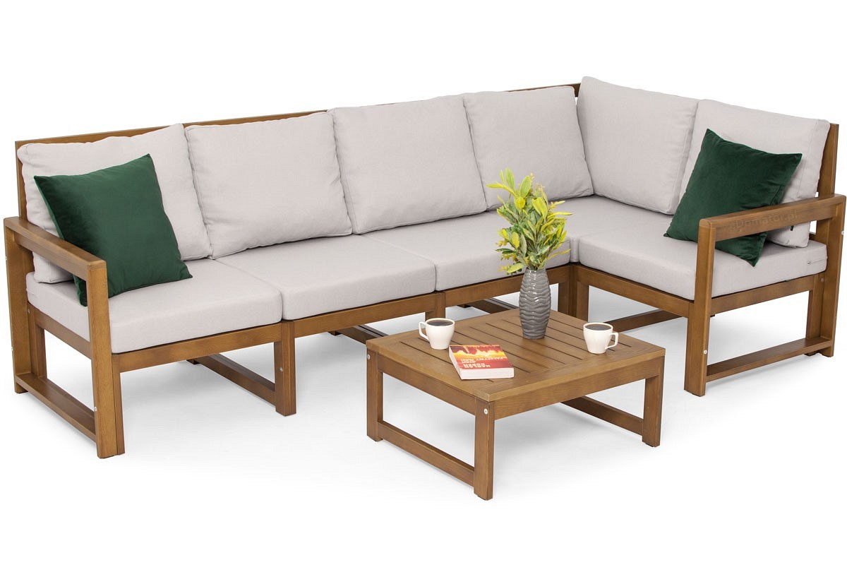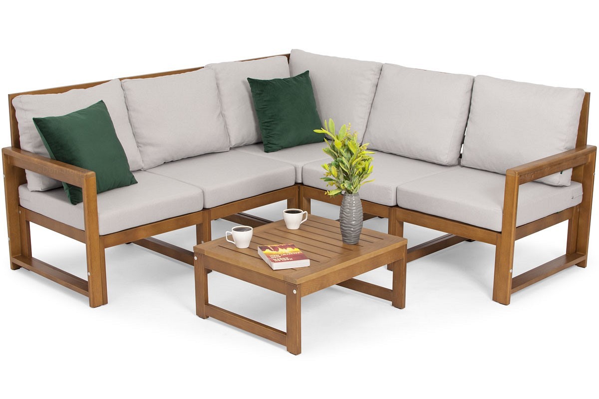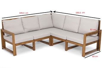 Minimalistyczny narożnik ogrodowy MALTA z jasnobrązowym stolikiem został zaprojektowany i wykonany w Polsce z najwyższej jakości materiałów. Drewniane meble ogrodowe charakteryzują się solidnym wykonaniem i dużą wytrzymałością. Sofa w stylu skandynawskim idealnie sprawdzi się na balkonie, tarasie czy w ogrodzie. Stelaż wykonany z drewna z certyfikatem FSC, które jest impregnowane, a następnie lakierowane, odporne na warunki atmosferyczne i pleśń. Drewniane meble ogrodowe z powodzeniem można ustawić w nasłonecznionym miejscu, ponieważ nie pogarsza to ich funkcji. Narożnik MALTA składa się z oddzielnych modułów, dzięki czemu można go dostosować do własnych potrzeb. W zależności od konfiguracji elementy serii mogą służyć do budowy narożników prawych lub lewych. Każda część składa się z szerokiego siedziska, oparcia i środkowych nóżek. W skład zestawu wchodzą moduły, moduł narożny, dwie podpory boczne oraz poduszka.