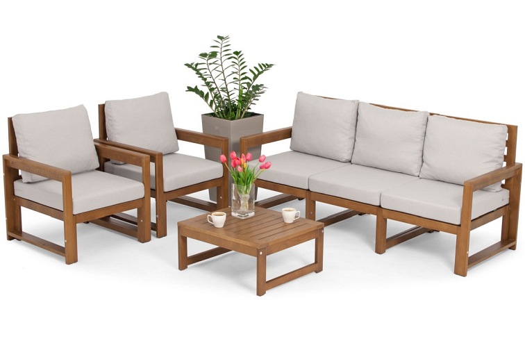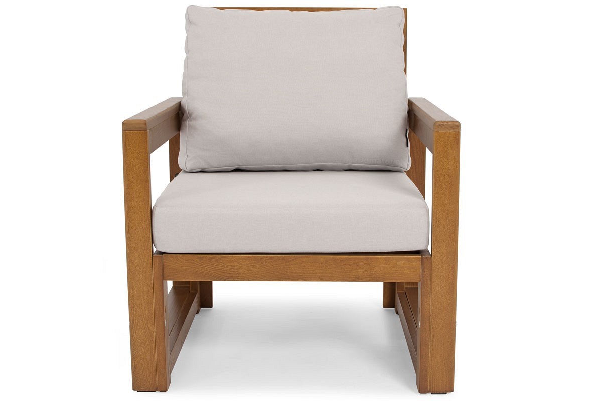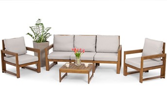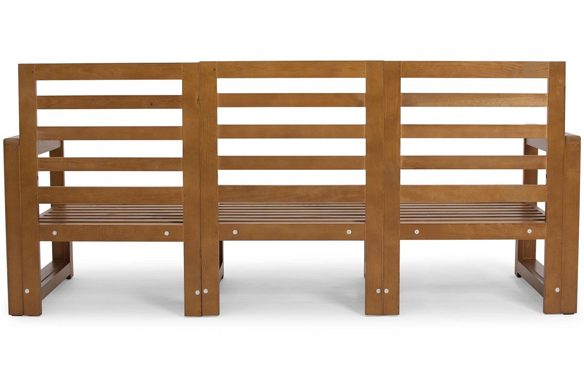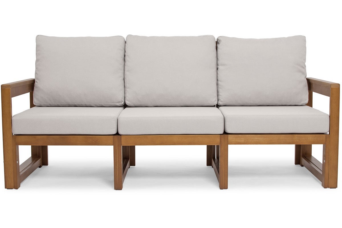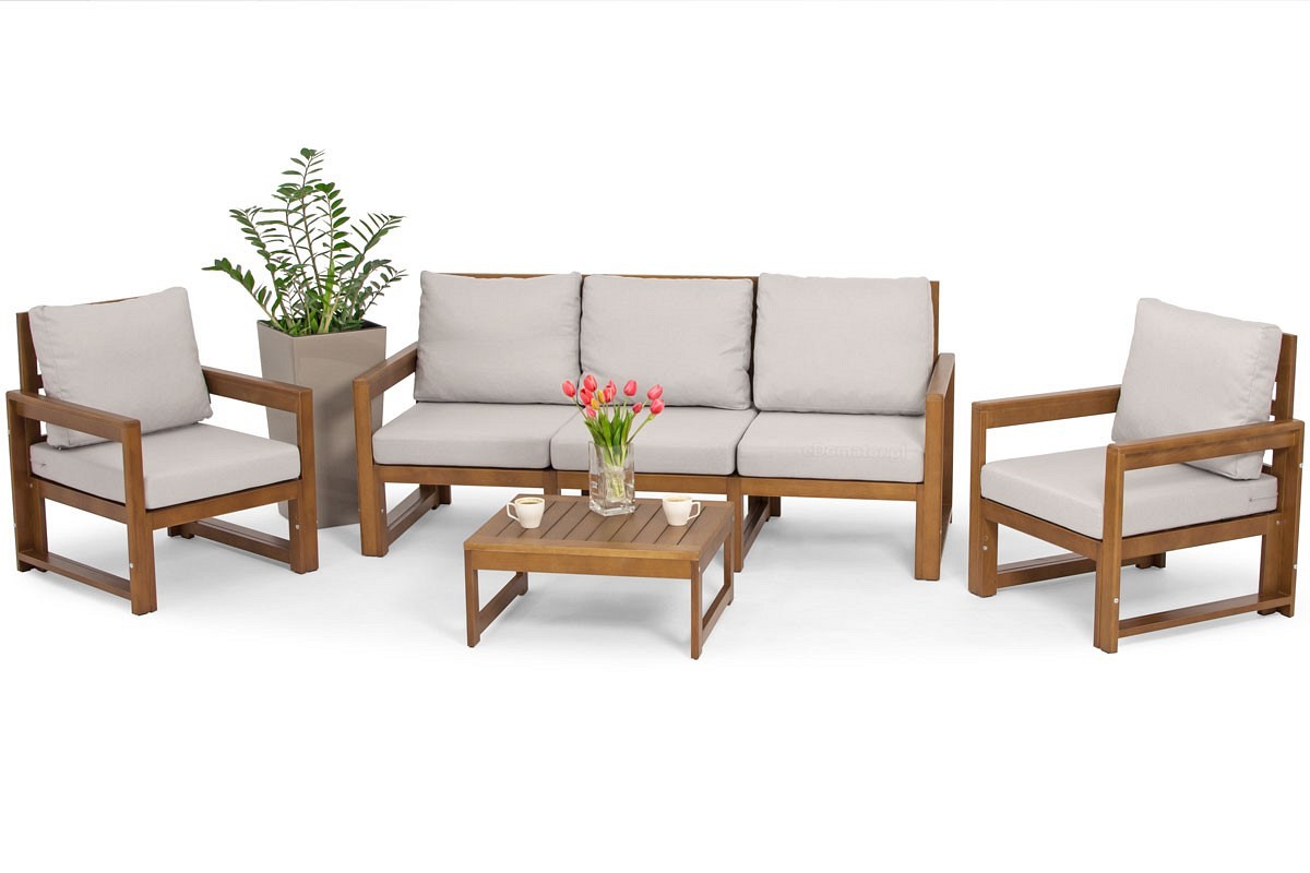 Drewniany zestaw ogrodowy MALTA o klasycznym kształcie dla 5 osób. W skład zestawu wchodzi sofa 3-osobowa, dwa fotele i niski stolik kawowy oraz grube poduszki na krzesłach i oparciach. Meble z naturalnego drewna są idealne do wnętrz boho i rustykalnych. Nowoczesna sofa ogrodowa w minimalistycznym stylu skandynawskim to połączenie naturalnych materiałów i klasycznego kształtu ławki. Drewniane meble doskonale sprawdzą się w nasłonecznionych częściach ogrodu, tarasu czy balkonu. Funkcjonalne fotele są bardzo wygodne i stabilne, posiadają ryflowane siedziska, które wyglądają bardzo elegancko nawet po wyjęciu poduszek. Uzupełnieniem zestawu jest niska ławka, która może służyć jako podnóżek. Jasnobrązowe drewniane ramy pięknie komponują się z jasnymi poduszkami. Konstrukcja jest bardzo wytrzymała dzięki wewnętrznym nóżkom, więc maksymalne obciążenie na jedno siedzisko to 120 kg. Meble MALTA wykonane są z wysokiej jakości drewna, impregnowanego i malowanego specjalną farbą odporną na warunki atmosferyczne i pleśń. Wyraźna struktura drewna nadaje niepowtarzalny charakter aranżacji balkonów, tarasów czy ogrodów.