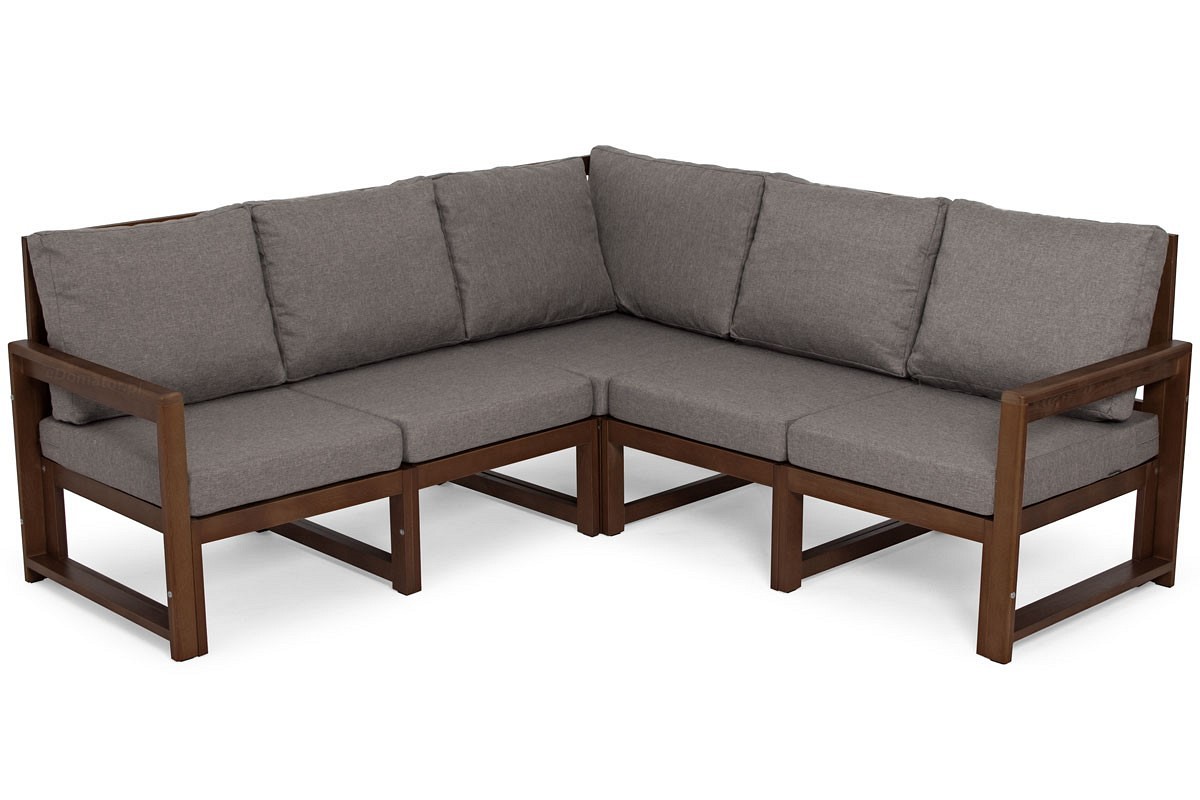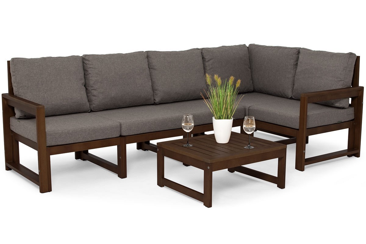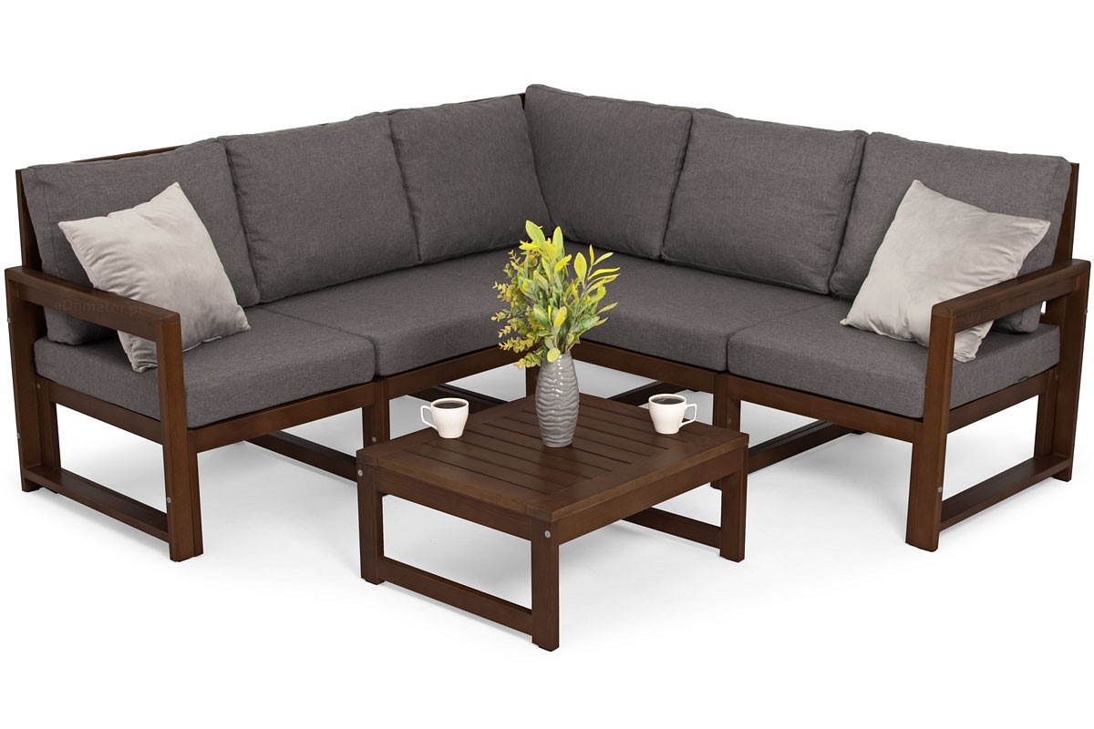 Minimalistyczny narożnik ogrodowy MALTA z ciemnobrązowym stolikiem został zaprojektowany i wyprodukowany w Polsce z najwyższej jakości materiałów. Drewniane meble ogrodowe charakteryzują się solidnym wykonaniem i dużą wytrzymałością. Sofa w stylu skandynawskim idealnie sprawdzi się na balkonie, tarasie czy w ogrodzie. Stelaż wykonany z drewna z certyfikatem FSC, które jest impregnowane, a następnie lakierowane, odporne na warunki atmosferyczne i pleśń. Drewniane meble ogrodowe z powodzeniem można ustawić w nasłonecznionym miejscu, ponieważ nie pogarsza to ich funkcji. Narożnik MALTA składa się z oddzielnych modułów, dzięki czemu można go dostosować do własnych potrzeb. W zależności od konfiguracji elementy serii mogą służyć do budowy narożników prawych lub lewych. Każda część składa się z szerokiego siedziska, oparcia i środkowych nóżek. W skład zestawu wchodzą moduły, moduł narożny, dwa wsporniki boczne oraz poduszka.
