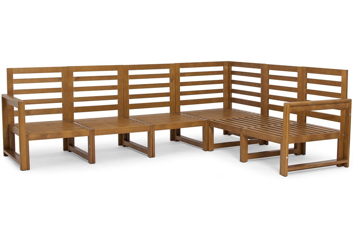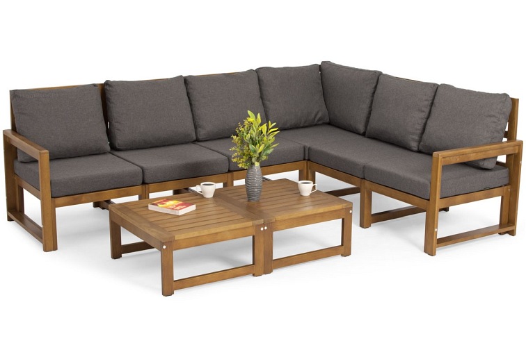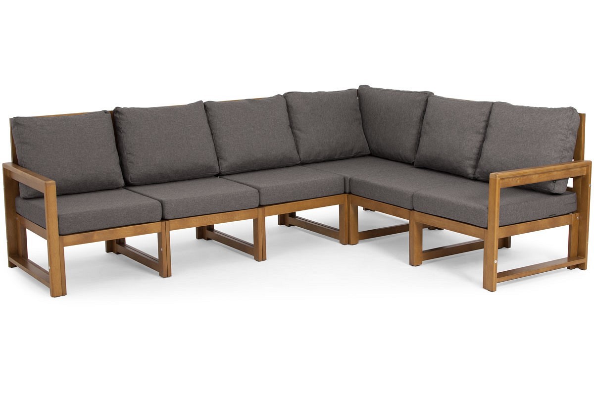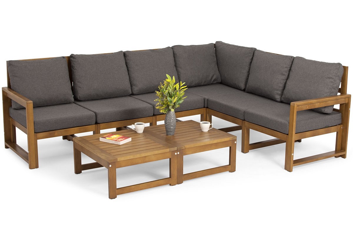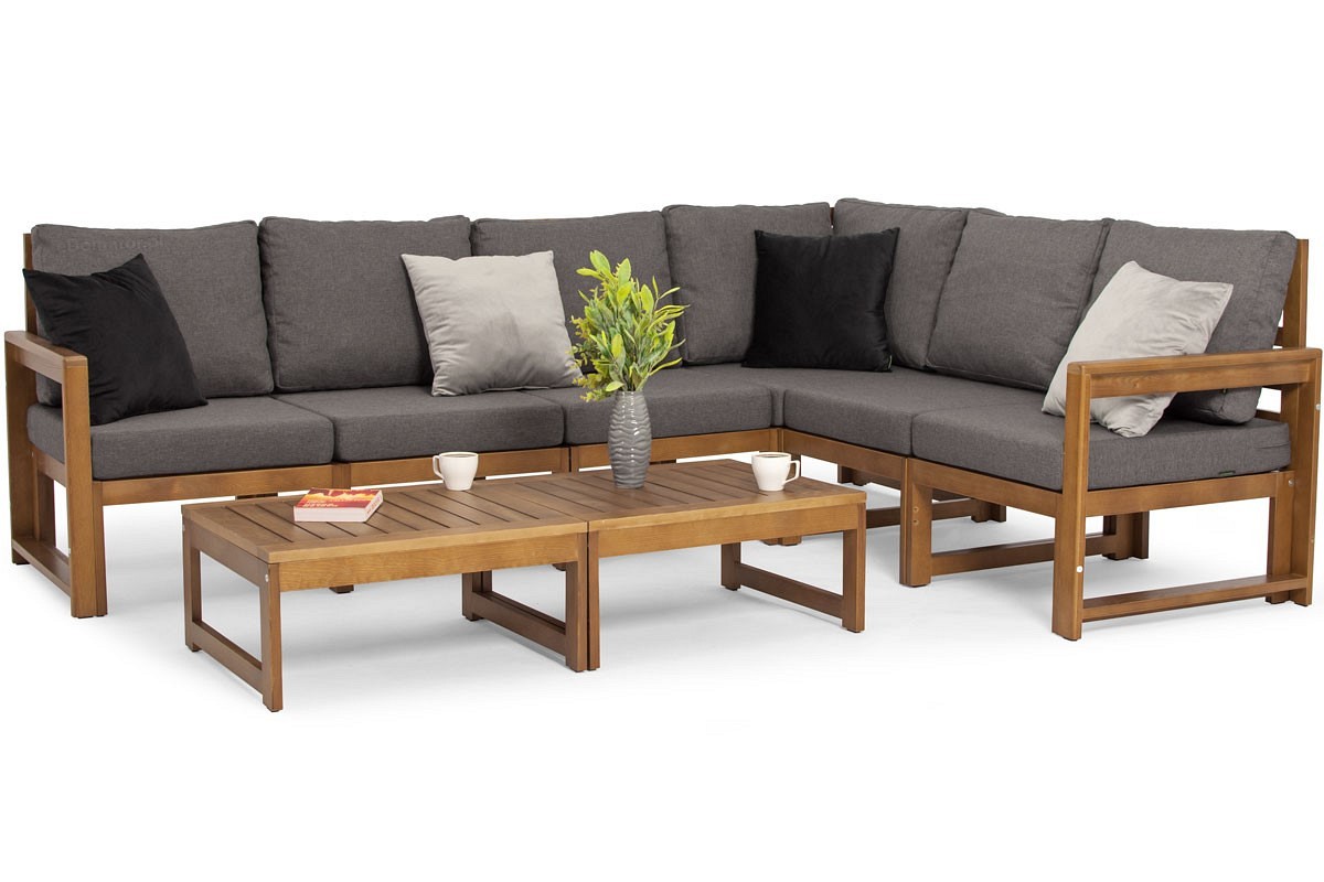 Drewniany narożnik ogrodowy MALTA XXL dla 6 osób w zestawie z dwoma stolikami kawowymi. Zestaw jest nowoczesny w kolorze jasnego brązu i w skandynawskim stylu. Dodatkowo krzesła i oparcia posiadają grube poduszki. Narożnik jest modułowy i uniwersalny – można go zamontować zarówno z lewej, jak i prawej strony. Daje to doskonałe możliwości organizacji i dostosowania do dostępnej przestrzeni. Nowoczesny narożnik w minimalistycznym stylu MALTA to połączenie naturalnych materiałów i klasycznej bryły narożnika. Drewniane meble doskonale sprawdzą się w nasłonecznionych częściach ogrodu, tarasu czy balkonu. Funkcjonalna sofa jest bardzo wygodna i stabilna, posiada ryflowane siedziska, które nawet po zdjęciu poduszek wyglądają bardzo elegancko. Zestaw uzupełniają dwie niskie ławki, które mogą służyć jako podnóżki. Jasnobrązowe drewniane ramy pięknie komponują się z jasnymi poduszkami. Konstrukcja jest bardzo wytrzymała dzięki wewnętrznym nóżkom, więc maksymalne obciążenie na siedzisko to 120 kg. Meble wykonane są z wysokiej jakości drewna, impregnowanego i malowanego specjalną farbą odporną na warunki atmosferyczne i pleśń. Wyraźna struktura drewna nadaje niepowtarzalny charakter aranżacji balkonów, tarasów czy ogrodów.