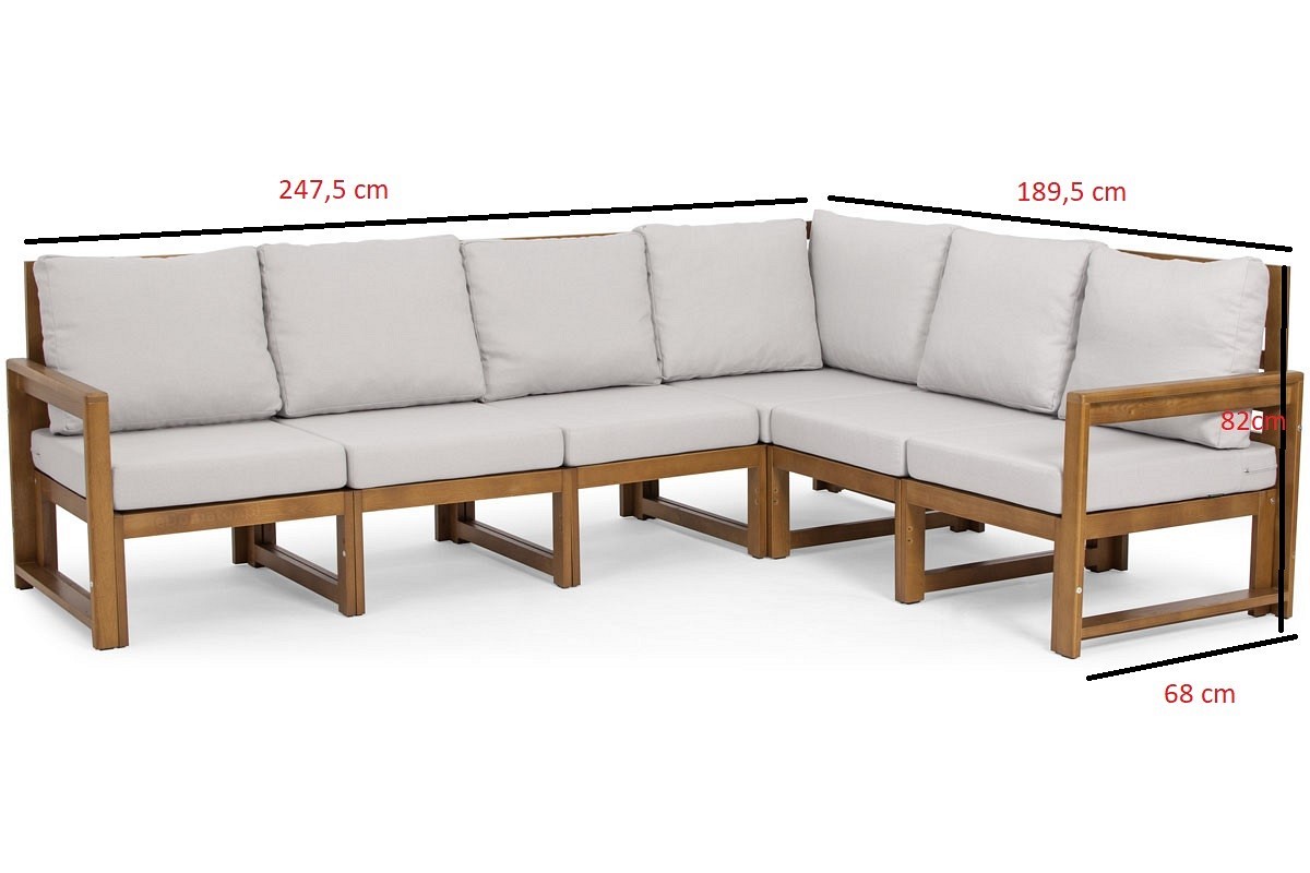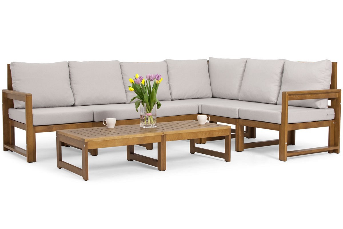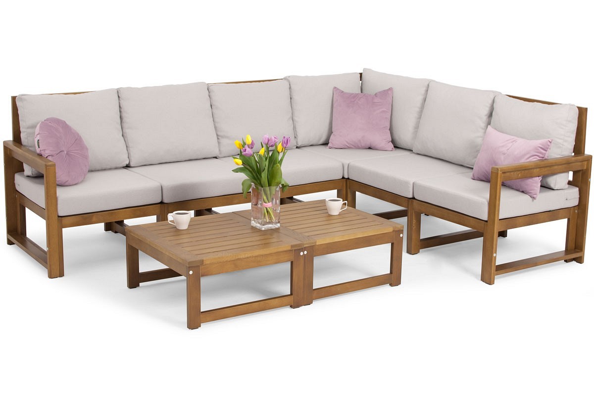 Drewniany narożnik ogrodowy MALTA XXL dla 6 osób w zestawie z dwoma stolikami kawowymi. Zestaw jest nowoczesny w kolorze jasnego brązu iw skandynawskim stylu. Dodatkowo krzesła i oparcia posiadają grube poduszki. Narożnik jest modułowy i uniwersalny – można go zamontować zarówno z lewej, jak i prawej strony. Daje to doskonałe możliwości organizacji i dostosowania do dostępnej przestrzeni. Nowoczesny narożnik w minimalistycznym stylu MALTA to połączenie naturalnych materiałów i klasycznej bryły narożnika. Drewniane meble doskonale sprawdzą się w nasłonecznionych częściach ogrodu, tarasu czy balkonu. Funkcjonalna sofa jest bardzo wygodna i stabilna, posiada ryflowane siedziska, które nawet po zdjęciu poduszek wyglądają bardzo elegancko. Zestaw uzupełniają dwie niskie ławki, które mogą służyć jako podnóżki. Jasnobrązowe drewniane ramy pięknie komponują się z jasnymi poduszkami. Konstrukcja jest bardzo wytrzymała dzięki wewnętrznym nóżkom, więc maksymalne obciążenie na siedzisko to 120 kg. Meble wykonane są z wysokiej jakości drewna, impregnowanego i malowanego specjalną farbą odporną na warunki atmosferyczne i pleśń. Wyraźna struktura drewna nadaje niepowtarzalny charakter aranżacji balkonów, tarasów czy ogrodów.